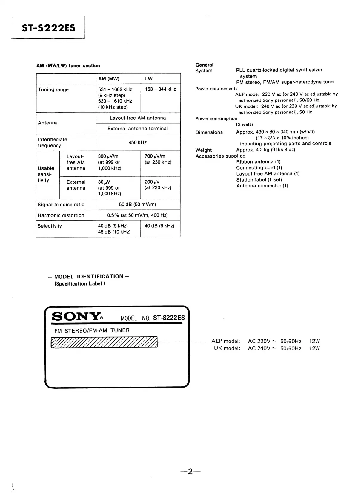 Sony ST-S222ES - AM;LW Tuner and General Specifications