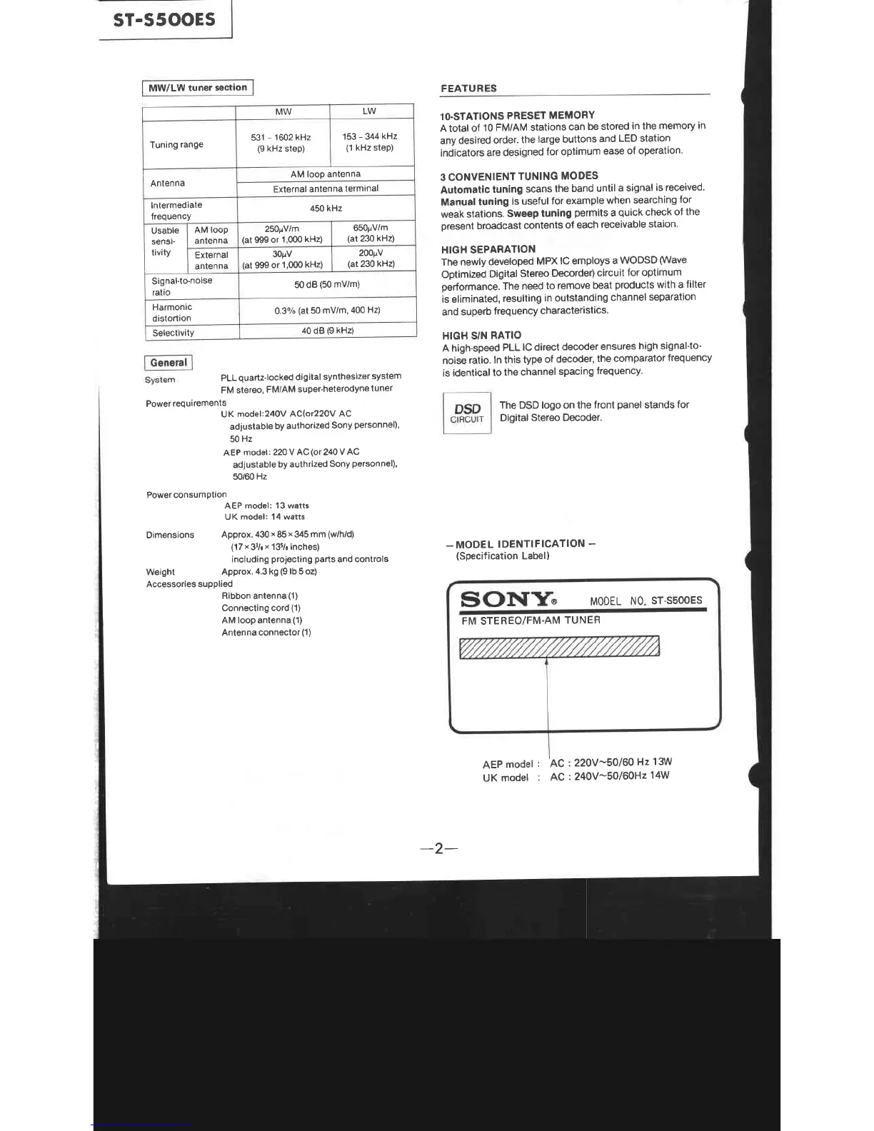 Sony ST-S500ES - Features; Preset Memory and Tuning Modes; Performance Characteristics; MW;LW Tuner Specifications