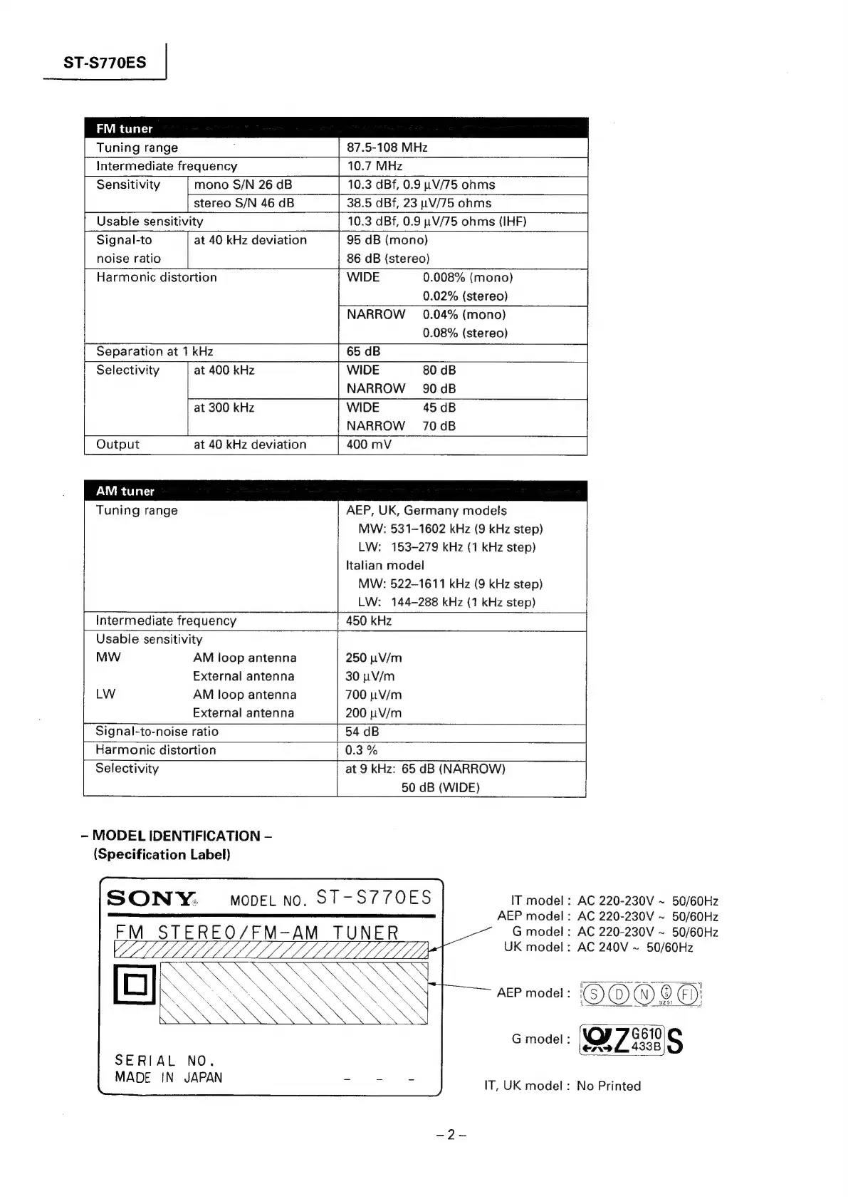 Sony ST-S770ES - FM Tuner Specifications; AM Tuner Specifications; Model Identification