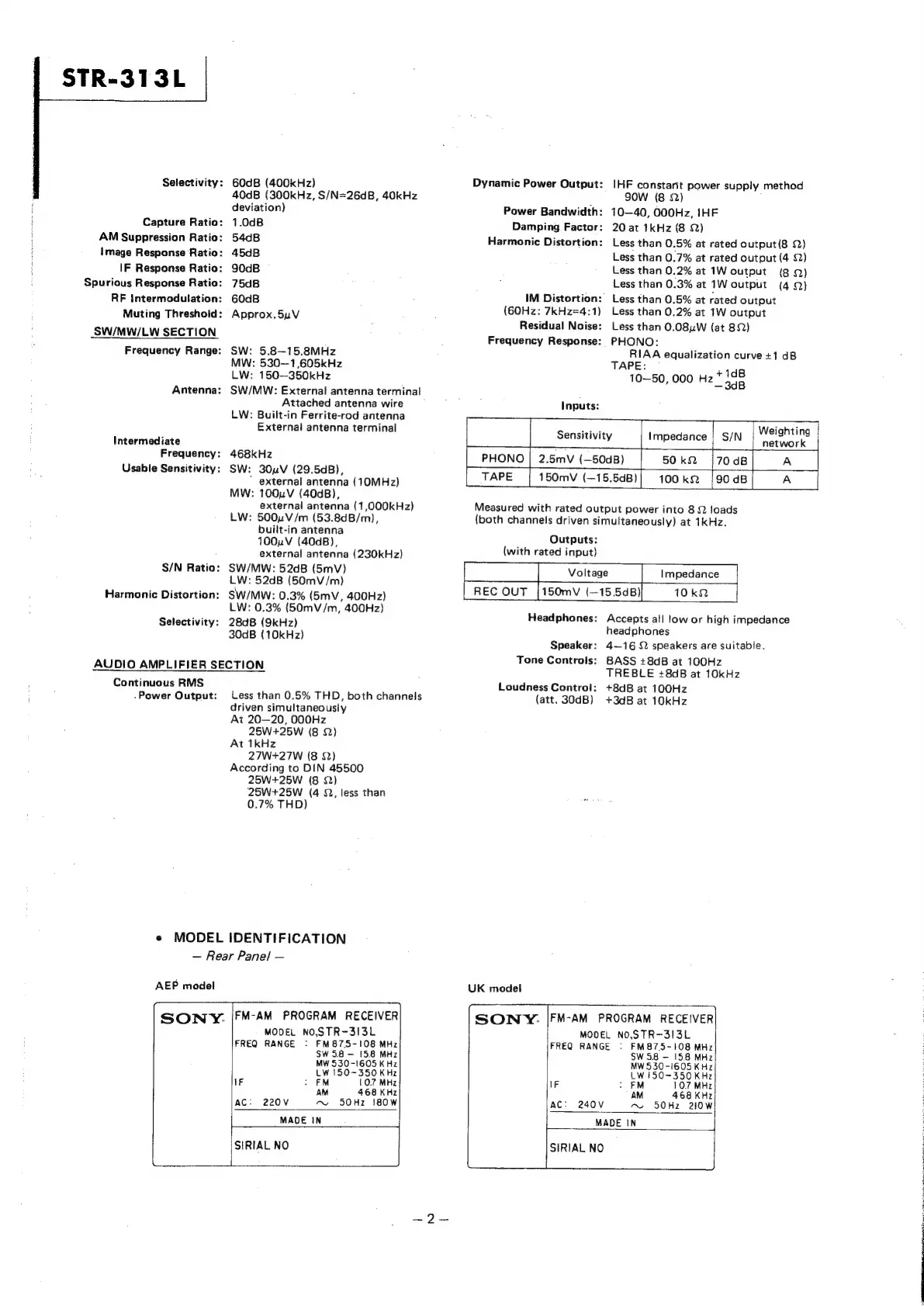 Sony STR-313L - SW;MW;LW SECTION; AUDIO AMPLIFIER SECTION; MODEL IDENTIFICATION