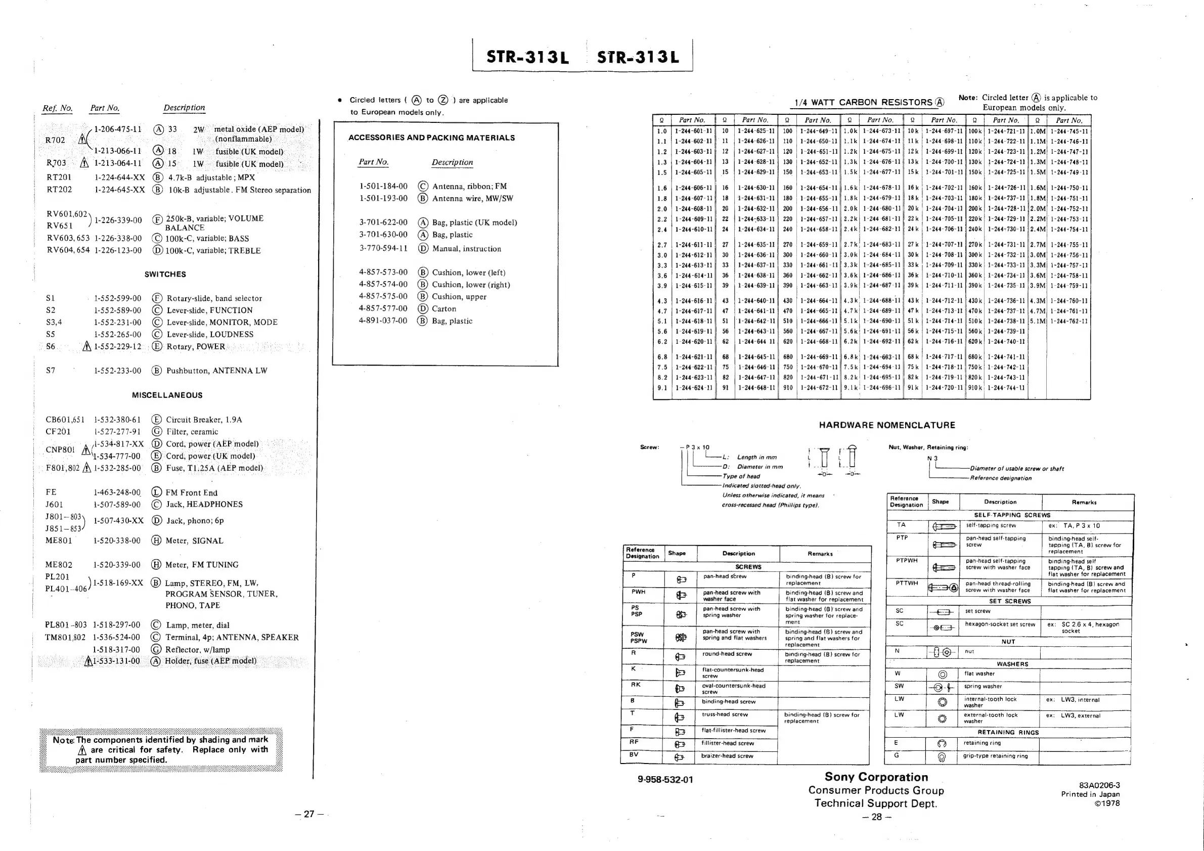 Sony STR-313L - ACCESSORIES AND PACKING MATERIALS; 1;4 Watt Carbon Resistors; Hardware Nomenclature