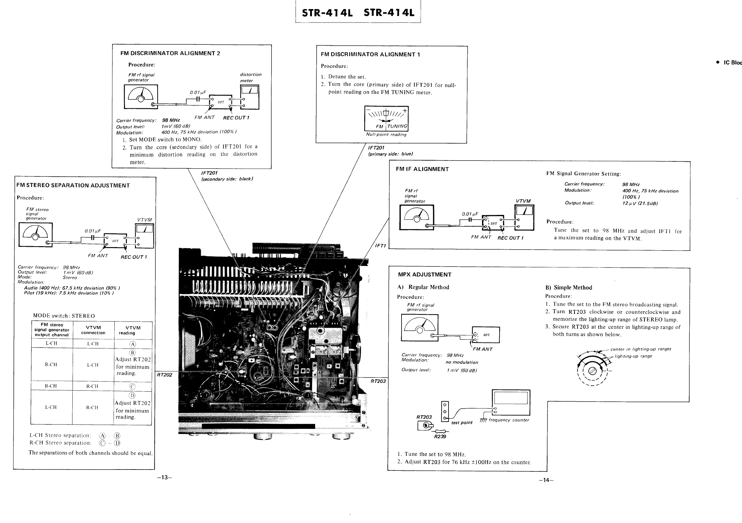 Sony STR-414L - FM ALIGNMENTS AND ADJUSTMENTS; FM Discriminator Alignment; FM Stereo Separation Adjustment; FM IF and MPX Adjustments