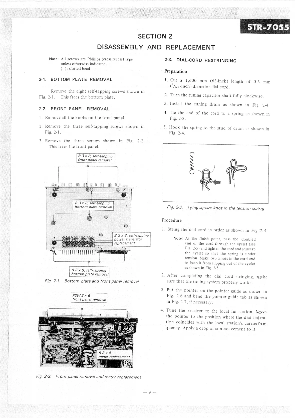 Sony STR-7055 - Disassembly and Replacement; Bottom Plate Removal; Front Panel Removal; Dial-Cord Restringing