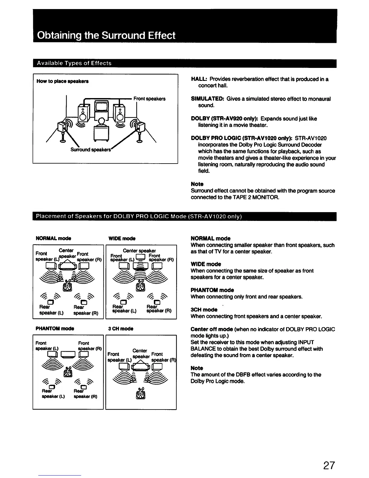 Sony STR-AV1020 - Obtaining the Surround Effect; Available Surround Effect Types; Speaker Placement for Surround Modes