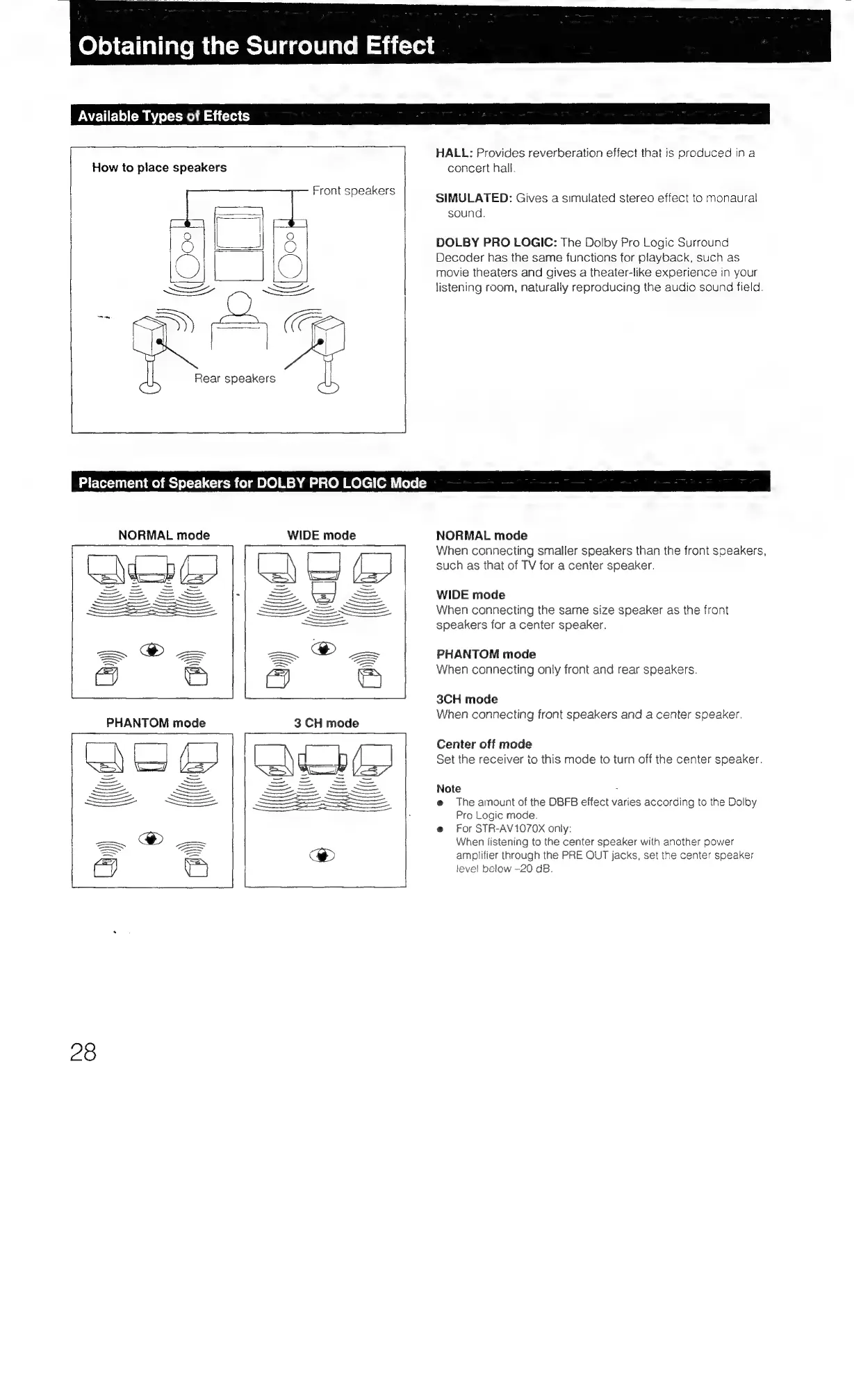 Sony STR-AV1070X - Obtaining the Surround Effect; Available Surround Effect Types; Dolby Pro Logic Speaker Placement