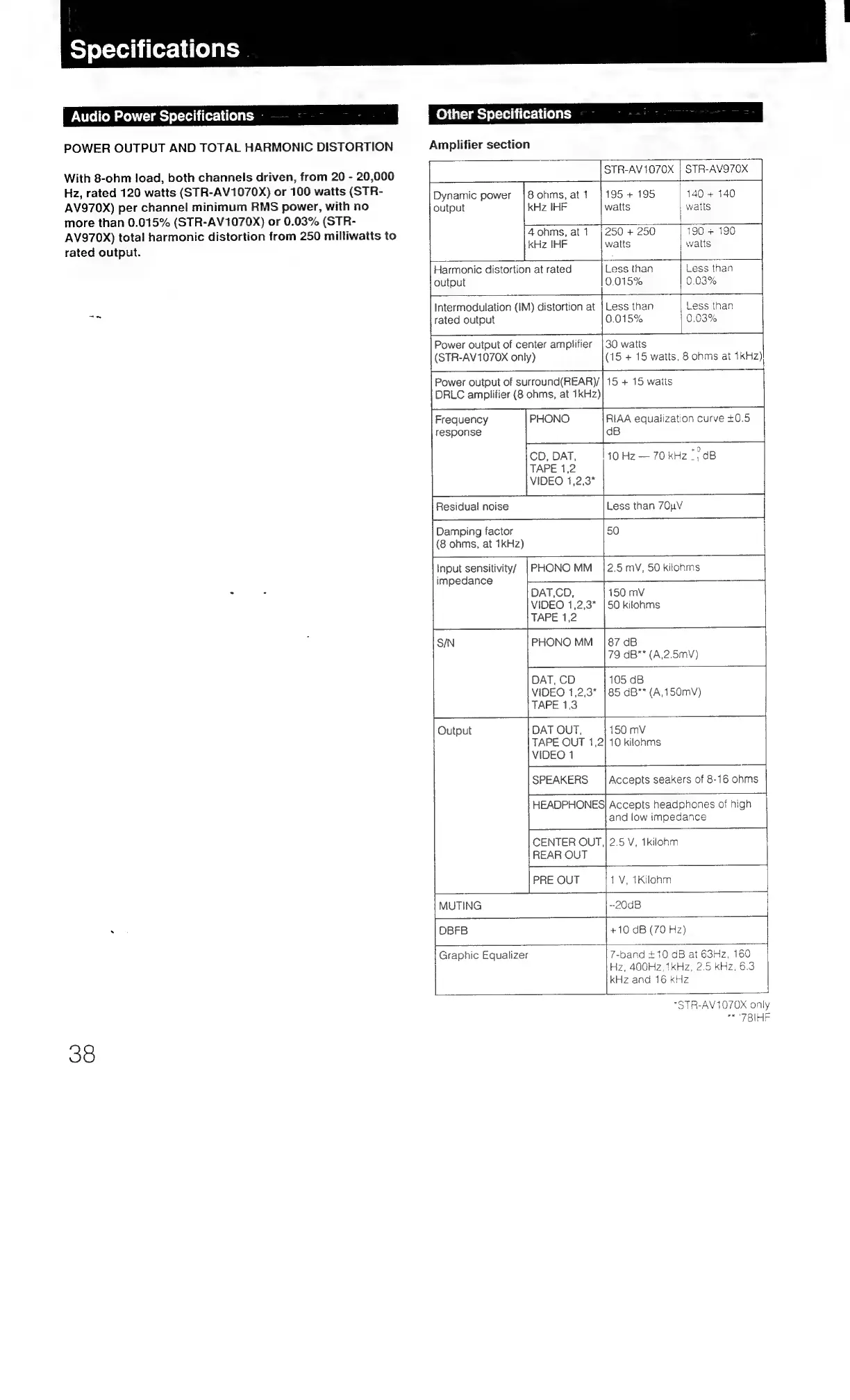 Sony STR-AV1070X - Specifications; Audio Power and Distortion Specifications; Amplifier Section Specifications