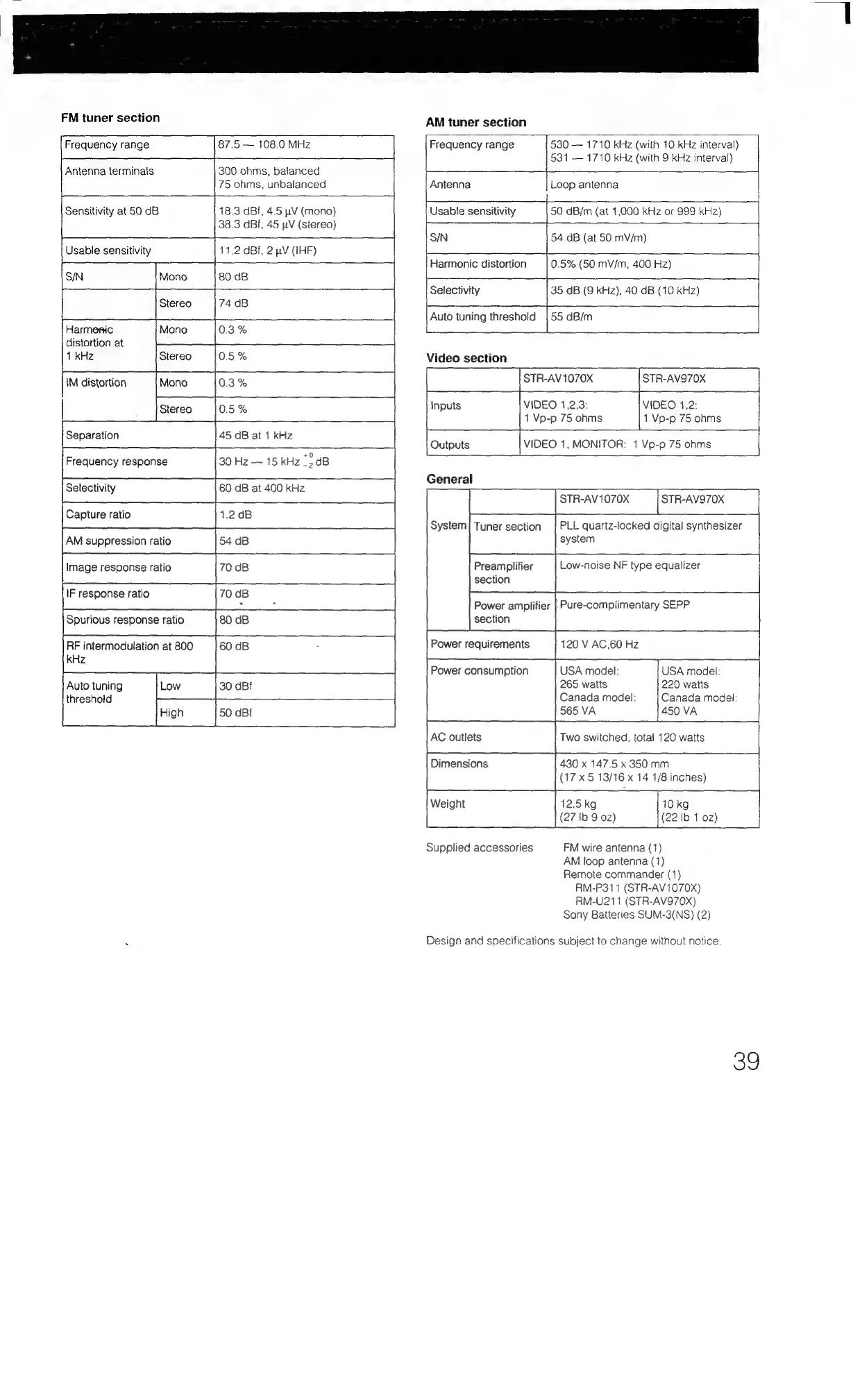 Sony STR-AV1070X - Tuner and Video Section Specifications; General and Power Specifications
