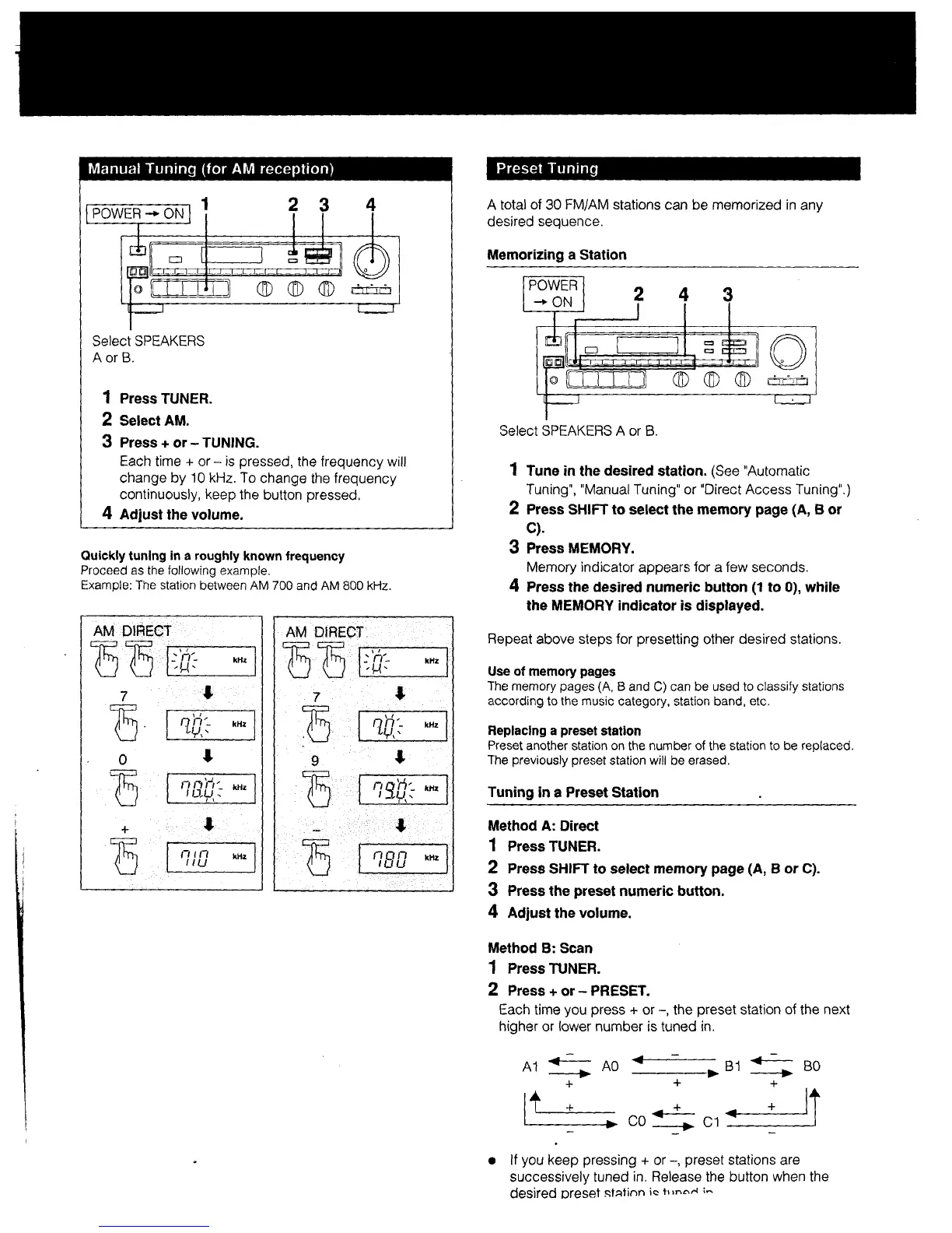 Sony STR-AV23 - Tuning Methods; Manual Tuning (for AM reception); Preset Tuning; Memorizing a Station