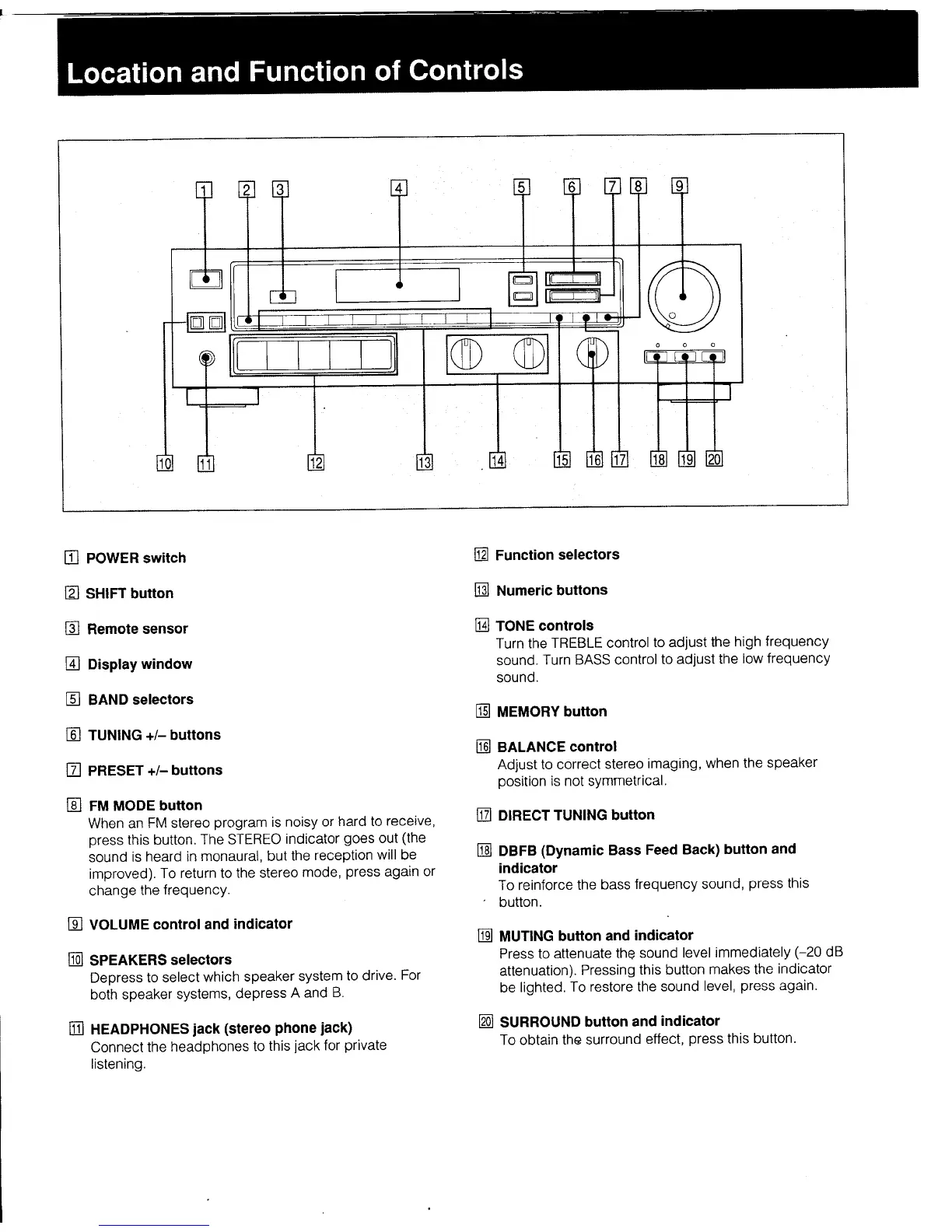 Sony STR-AV23 - Location and Function of Controls; Front Panel Controls Overview; Function Selectors; Tone Controls