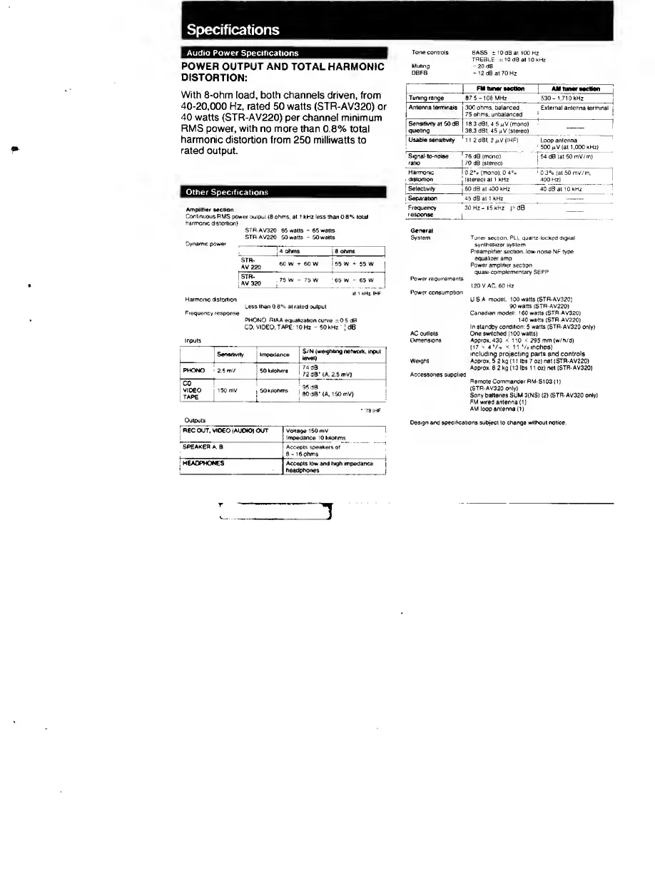Sony STR-AV320 - Specifications; Audio Power Specifications; Amplifier and Tuner Specifications; General Specifications