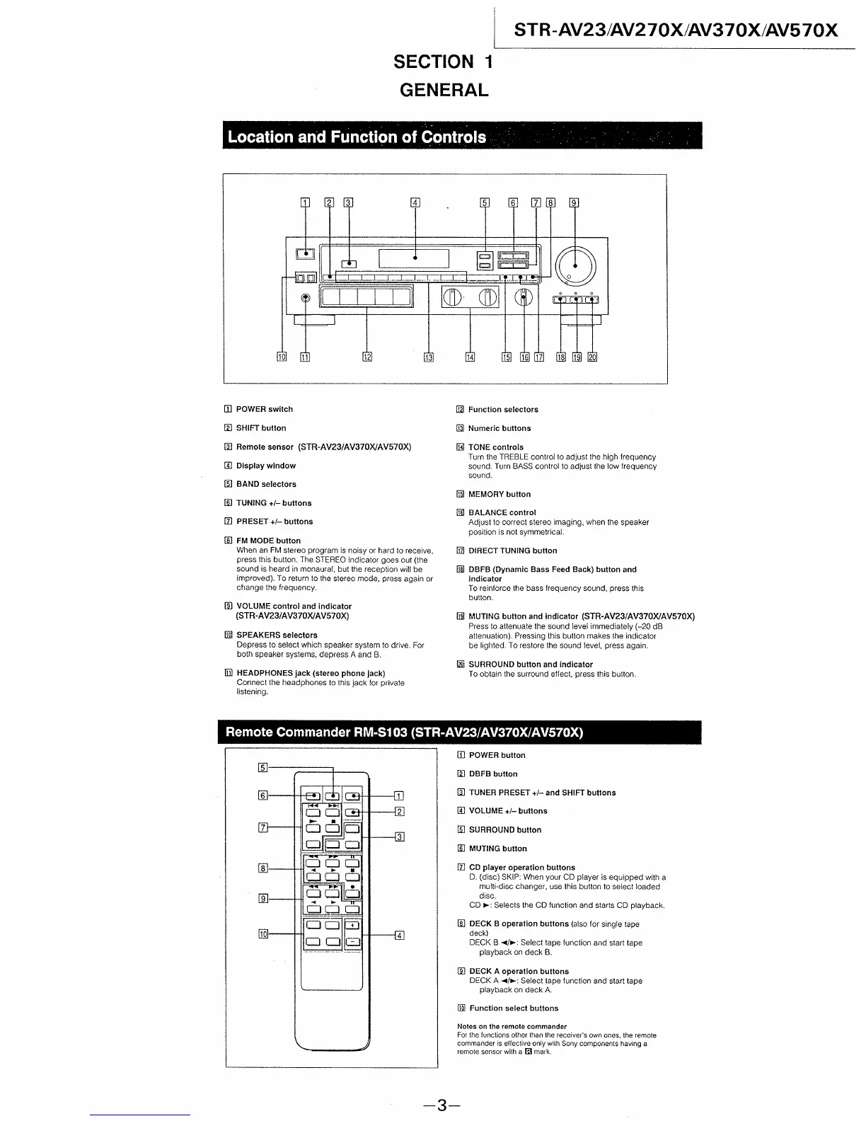 Sony STR-AV370X - General Information and Controls; Location and Function of Controls