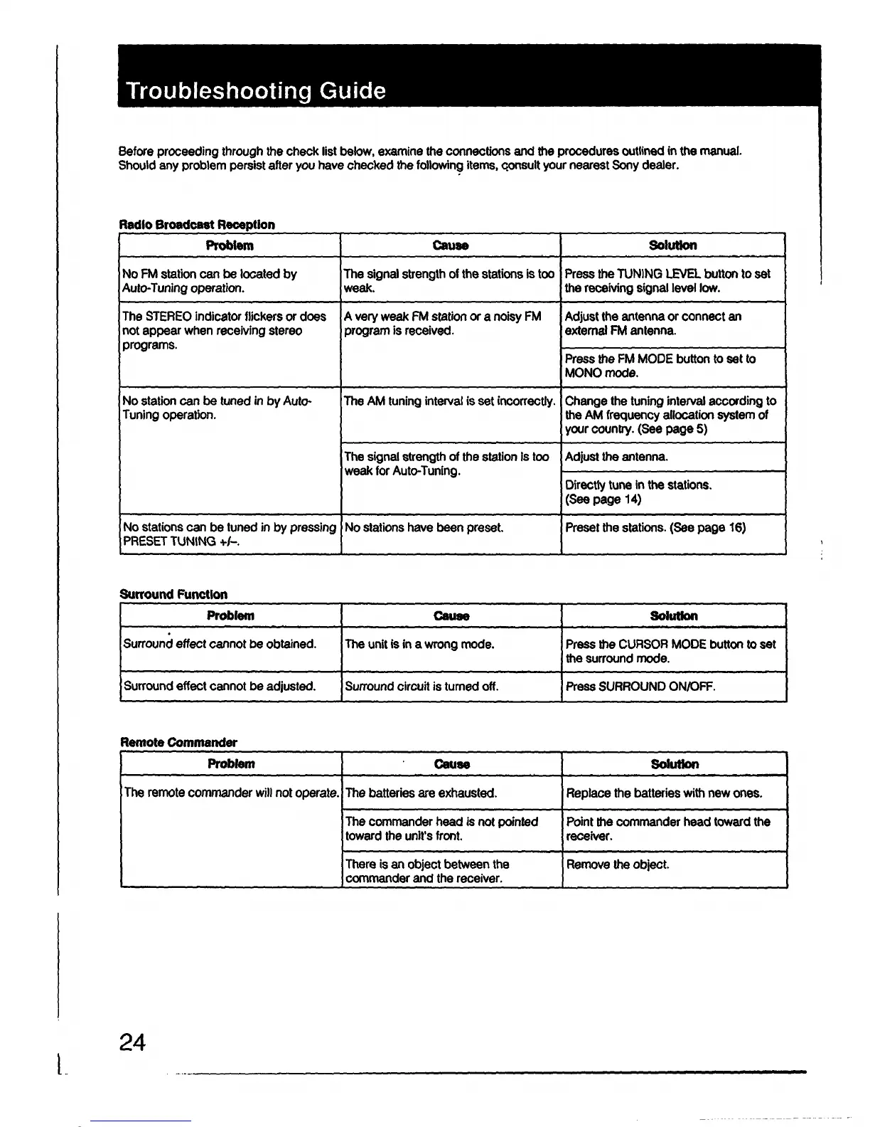 Sony STR-AV53 - Troubleshooting Guide; Radio Reception Issues; Surround Function Problems; Remote Commander Issues