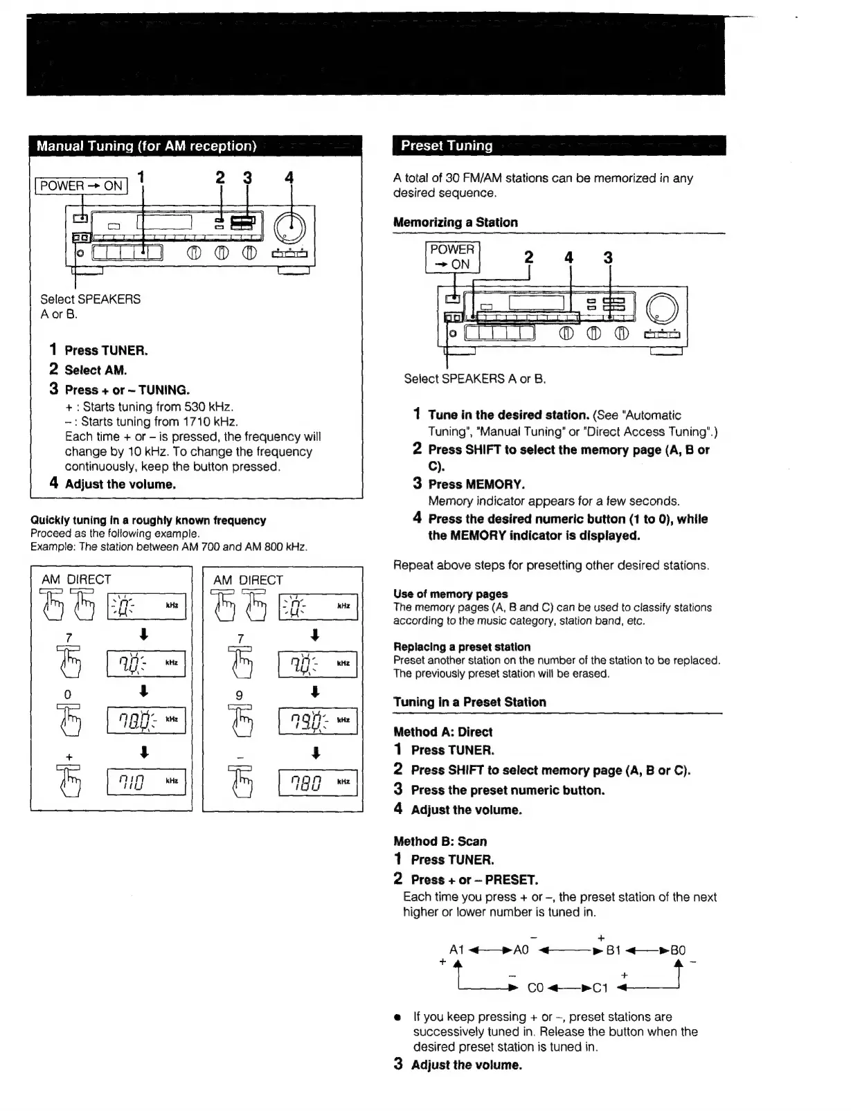 Sony STR-AV570X - Manual Tuning (for AM reception); Quickly Tuning AM Stations; Preset Tuning; Memorizing and Recalling Stations