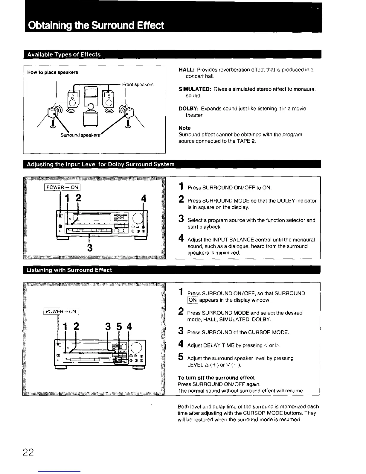 Sony STR-AV720 - Surround Sound Effects; Available Surround Types; Dolby Surround Input Level Adjustment; Using Surround Sound