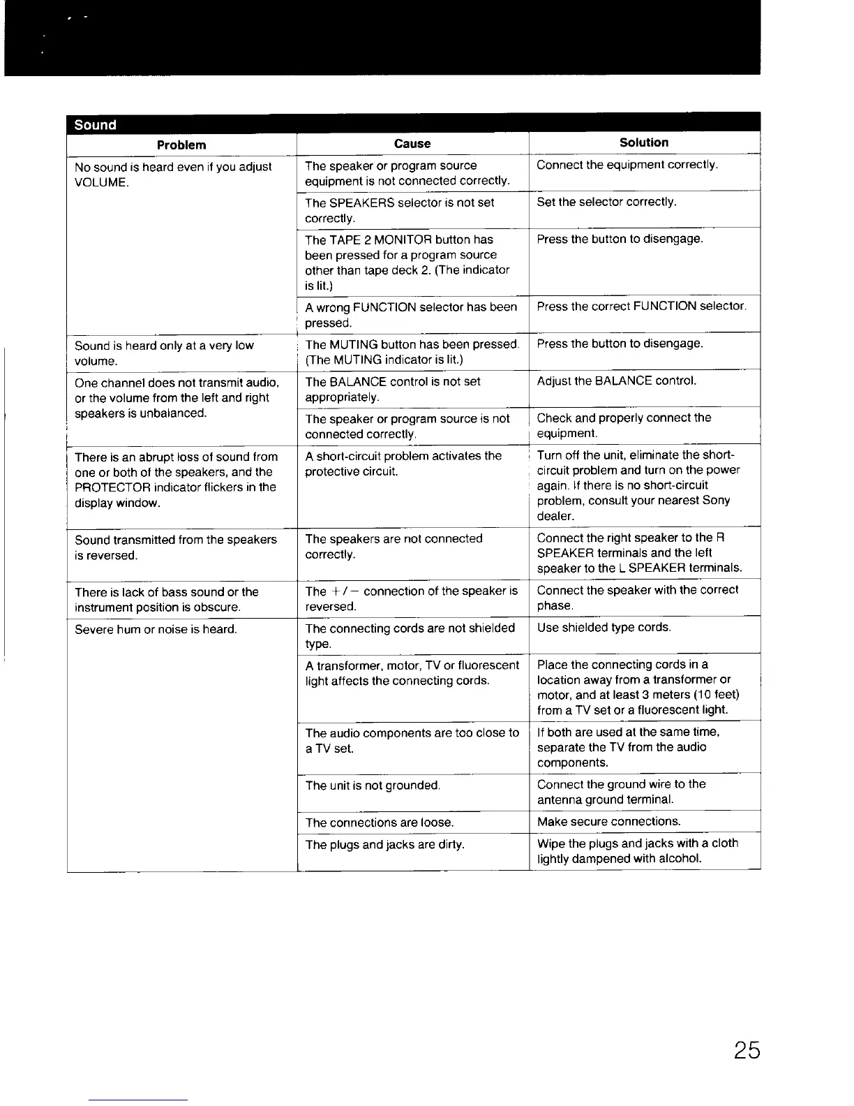 Sony STR-AV720 - Sound Troubleshooting; No Sound, Low Volume, and Channel Issues; Sound Loss, Noise, and Hum