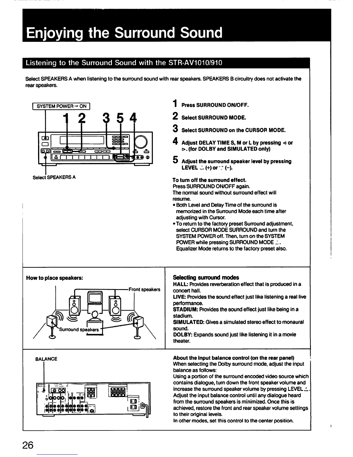 Sony STR-AV910 - Enjoying the Surround Sound; Surround Sound (STR-AV1010;910); Selecting Surround Modes