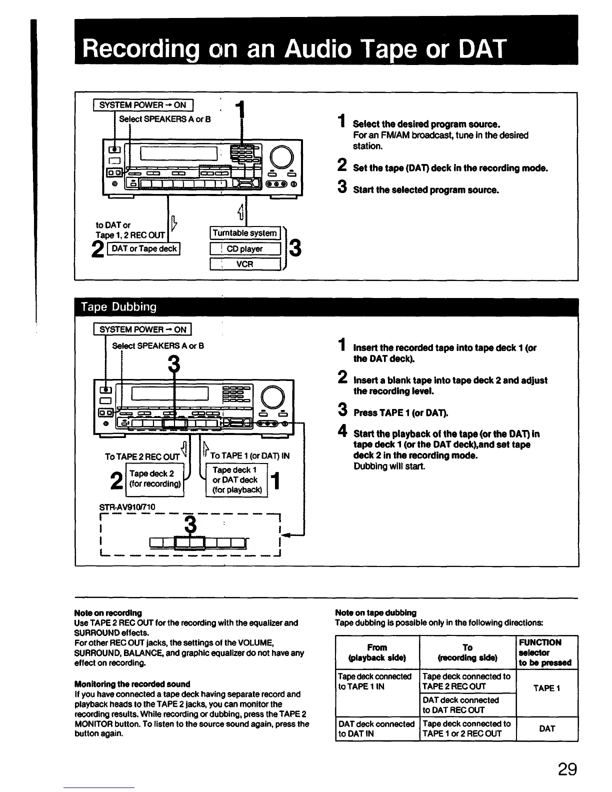Sony STR-AV910 - Recording on Audio Tape or DAT; Recording Procedure; Tape Dubbing