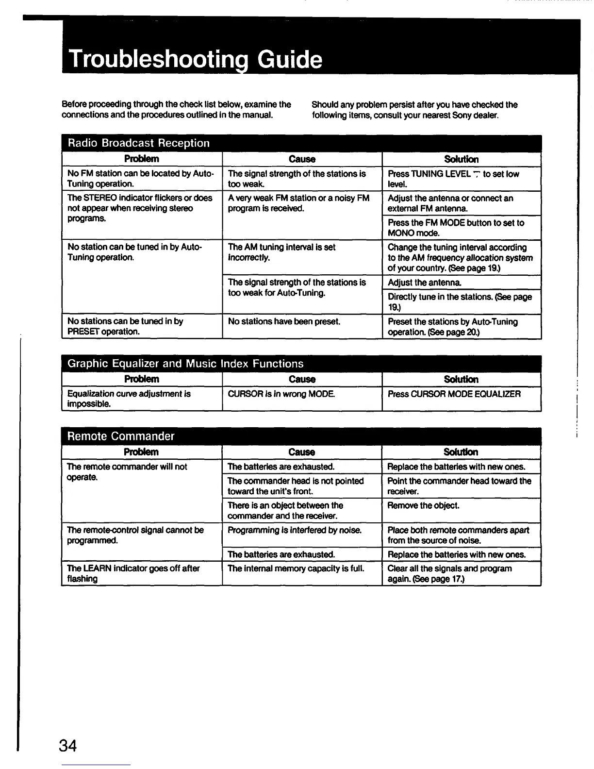 Sony STR-AV910 - Troubleshooting Guide; Radio Broadcast Reception Issues; Remote Commander Issues