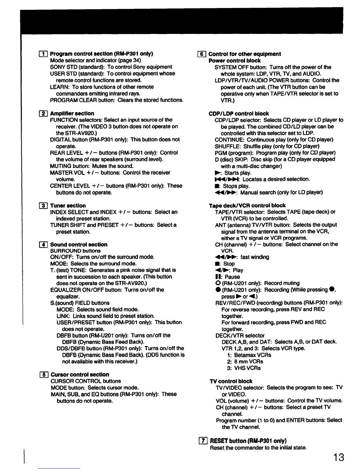 Sony STR-AV920 - Remote Commander Operation; Remote Button Functions; Controlling External Equipment
