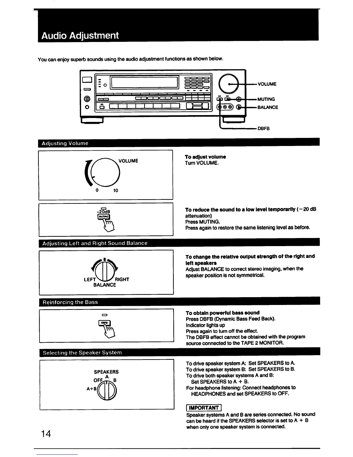 Sony STR-AV920 - Audio Adjustments; Volume and Balance Control; Bass Enhancement (DBFB); Speaker System Selection