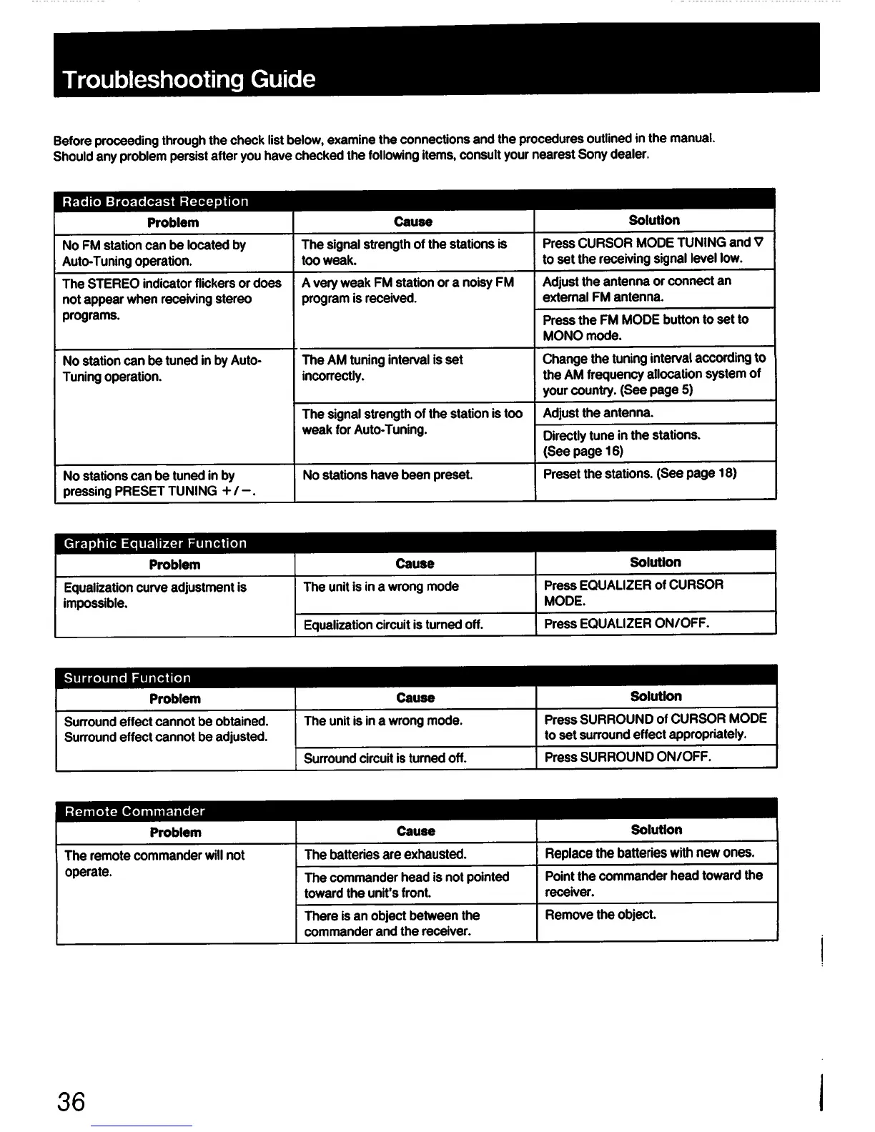 Sony STR-AV920 - Troubleshooting Guide; Radio Reception Problems; Equalizer and Surround Issues; Remote Commander Malfunctions