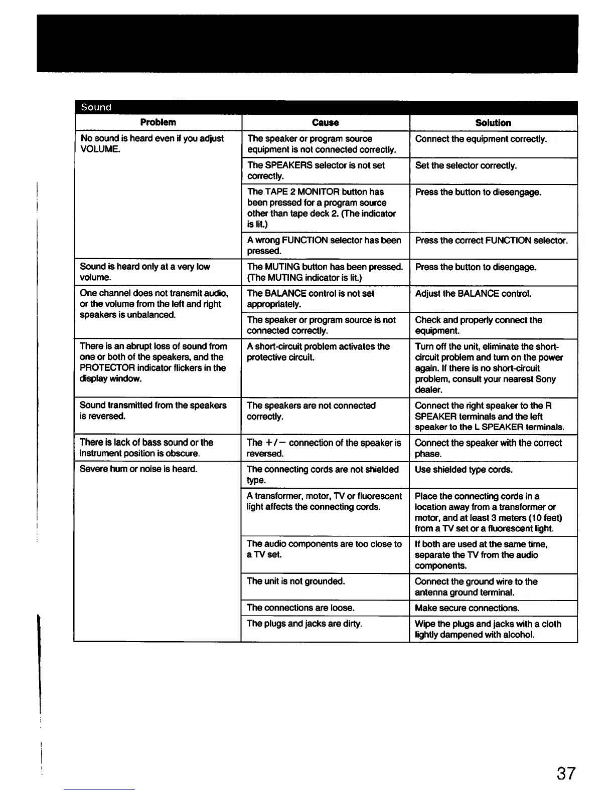 Sony STR-AV920 - Troubleshooting Guide; Audio Output Problems; Noise, Hum, and Connection Issues