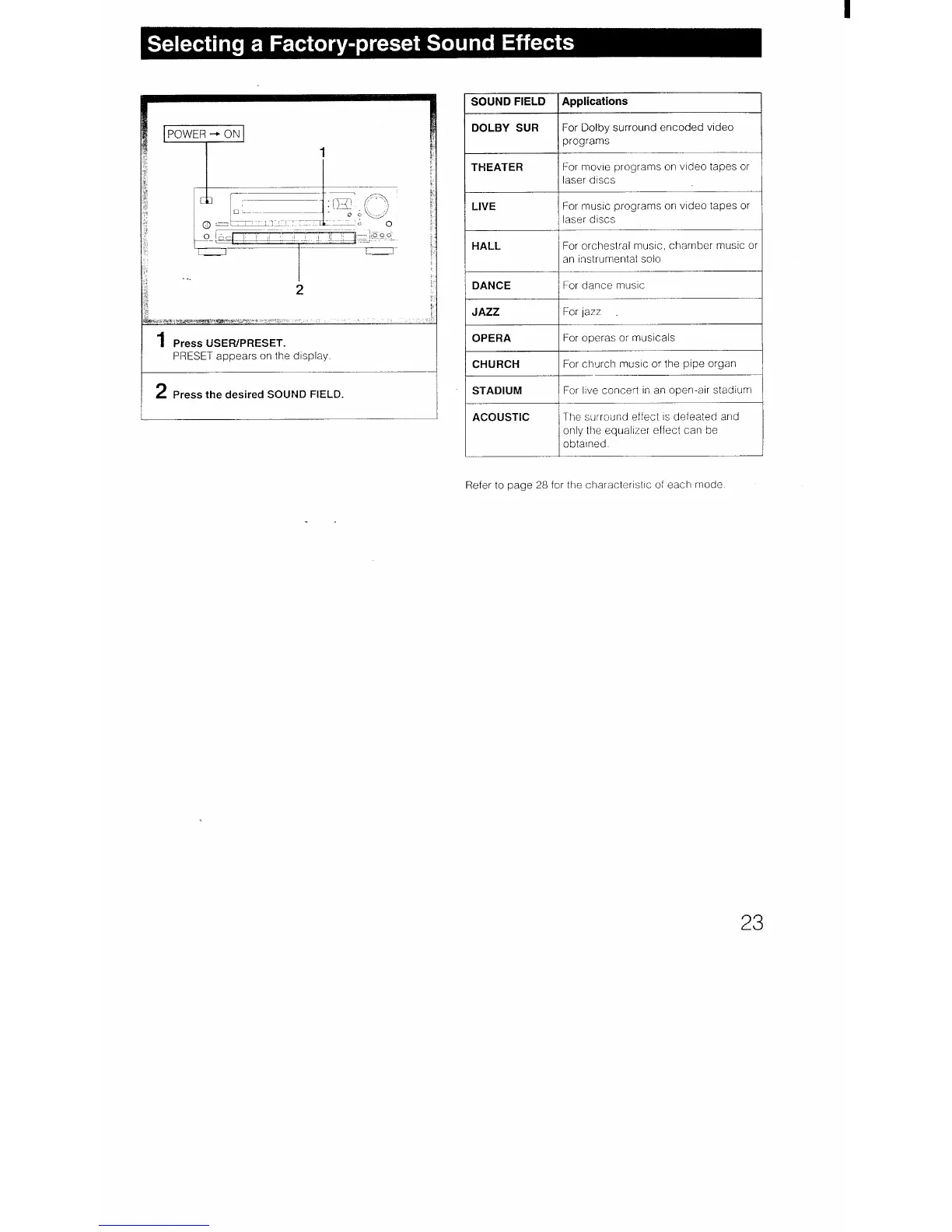 Sony STR-D1011 - Preset Sound Effects; DOLBY SUR; THEATER Mode; LIVE Mode