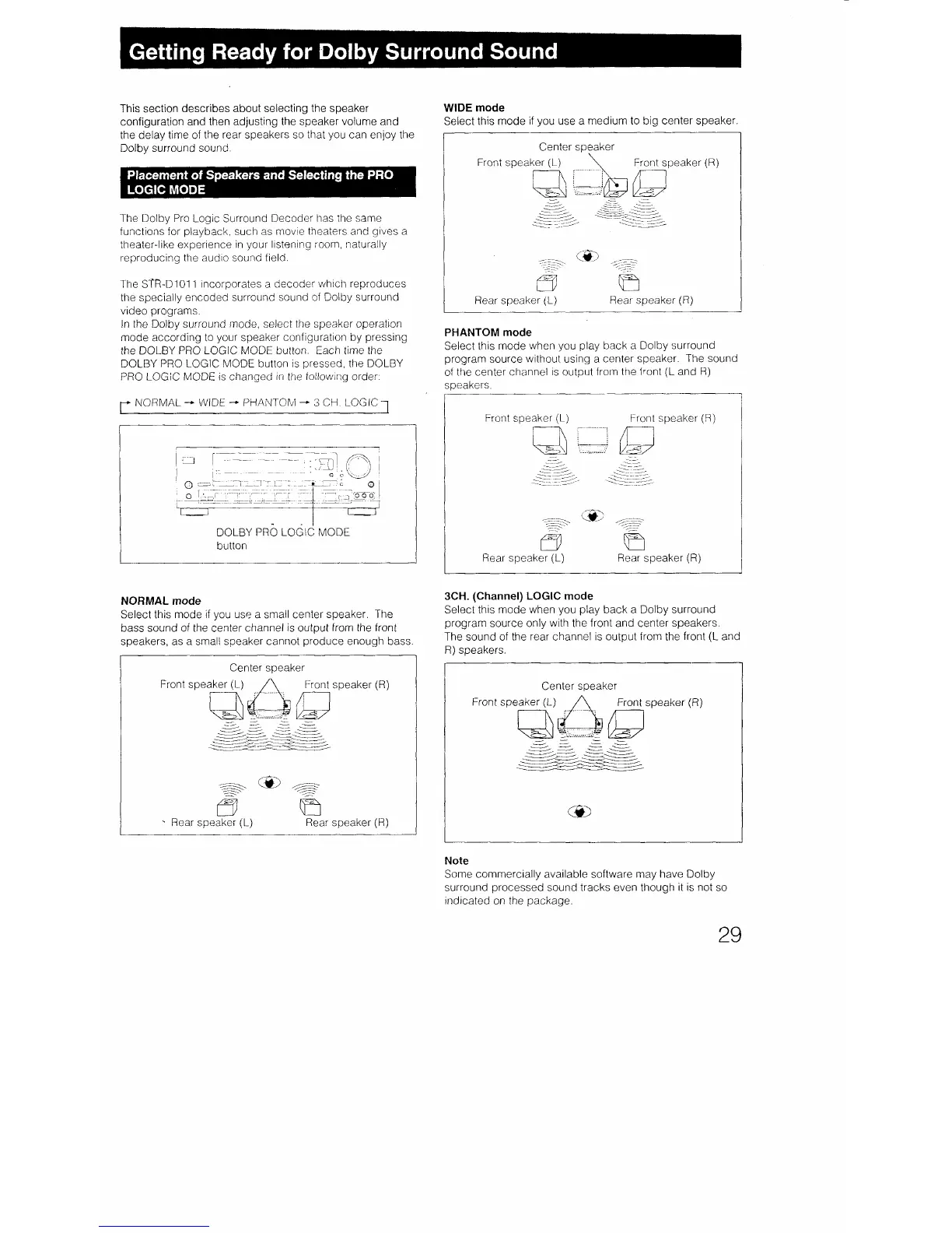 Sony STR-D1011 - Dolby Surround Setup; Speaker Placement and PRO LOGIC Mode
