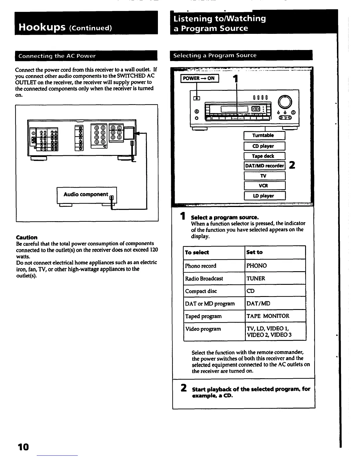Sony STR-D1015 - Hookups (Continued); Connecting the AC Power; Chapter 2 Basic Operations; Selecting a Program Source