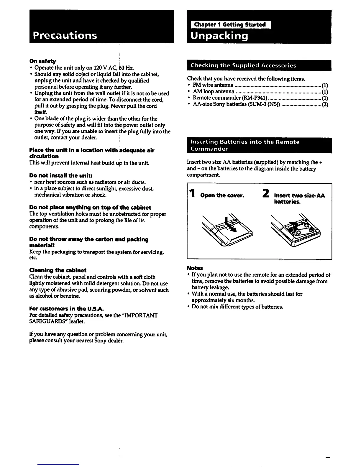 Sony STR-D1015 - Precautions; Safety, Placement, and Maintenance; Chapter 1 Getting Started; Unpacking and Remote Setup