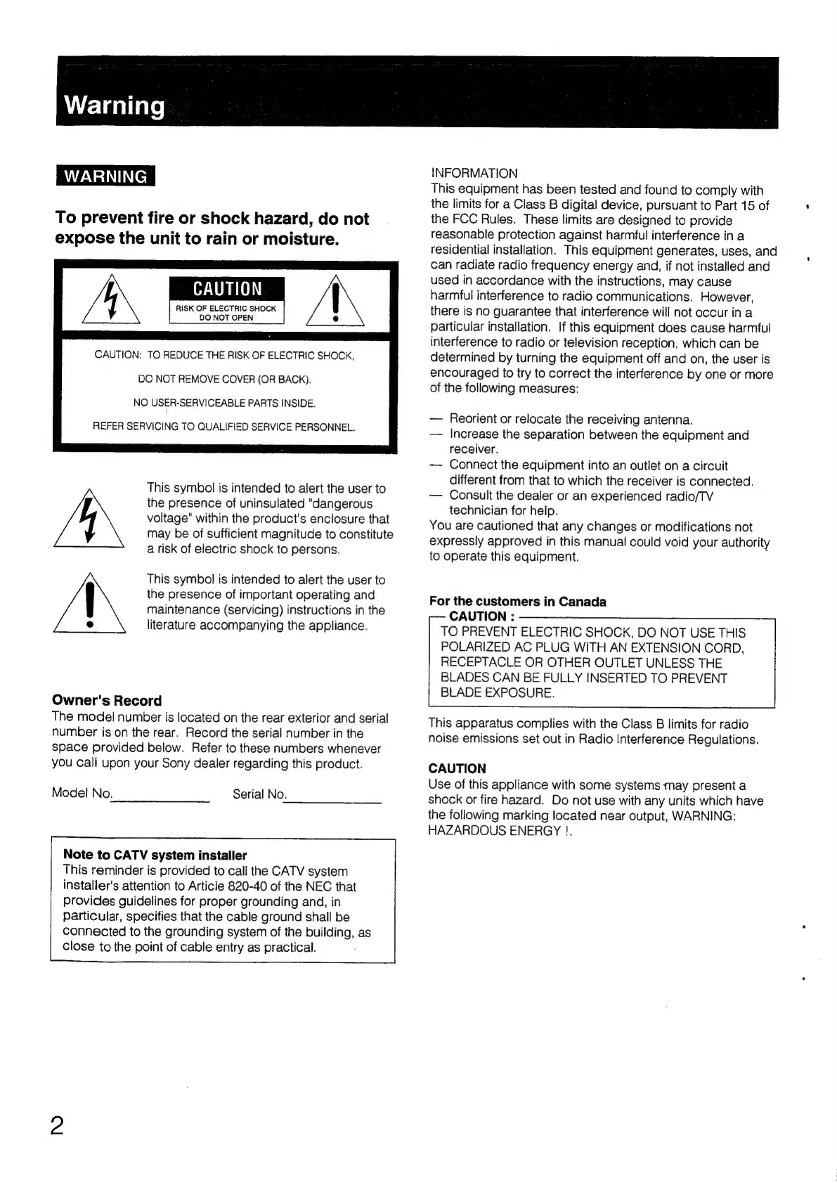 Sony STR-D1090 - Warning and Safety Information; General Electrical and Fire Hazards; FCC Compliance and Interference Mitigation; Owners Record and CATV Installer Notes