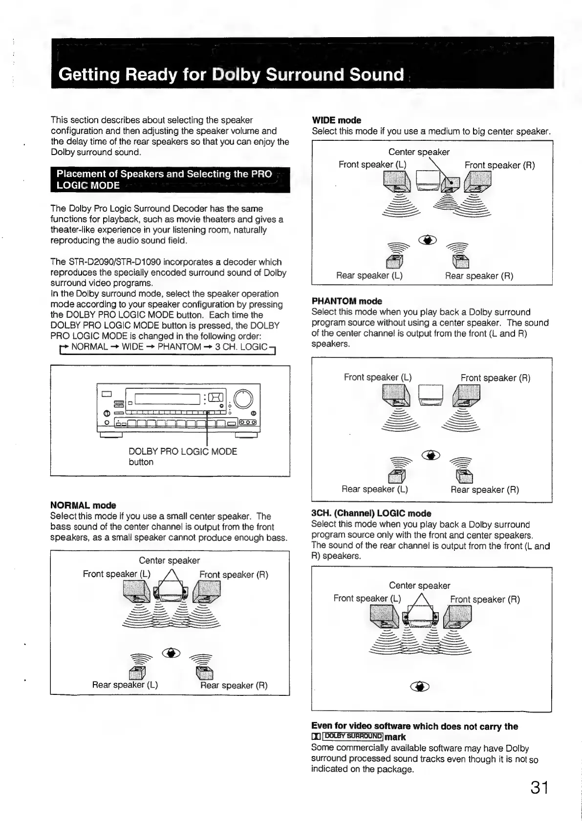 Sony STR-D1090 - Getting Ready for Dolby Surround Sound; Speaker Placement and PRO LOGIC MODE Selection