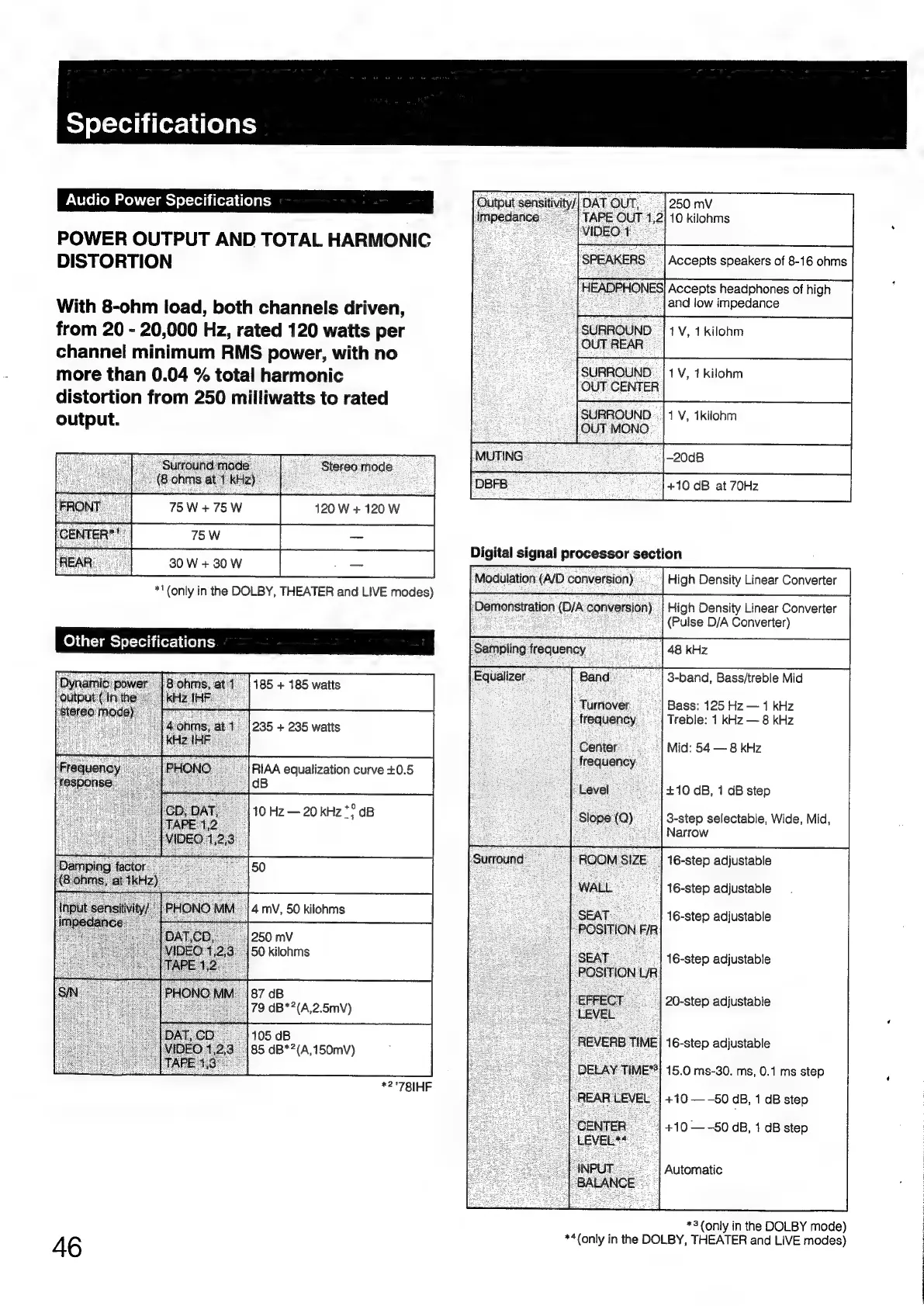 Sony STR-D1090 - Specifications: Audio and DSP; Audio Power Output Specifications; Digital Signal Processor Specifications