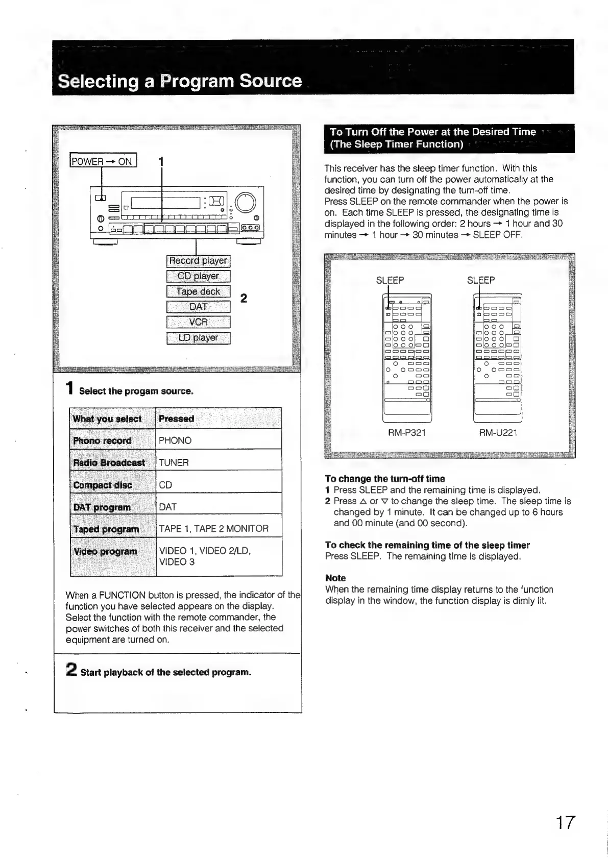 Sony STR-D2090 - Selecting Program Sources and Sleep Timer; Selecting a Program Source; Sleep Timer Function