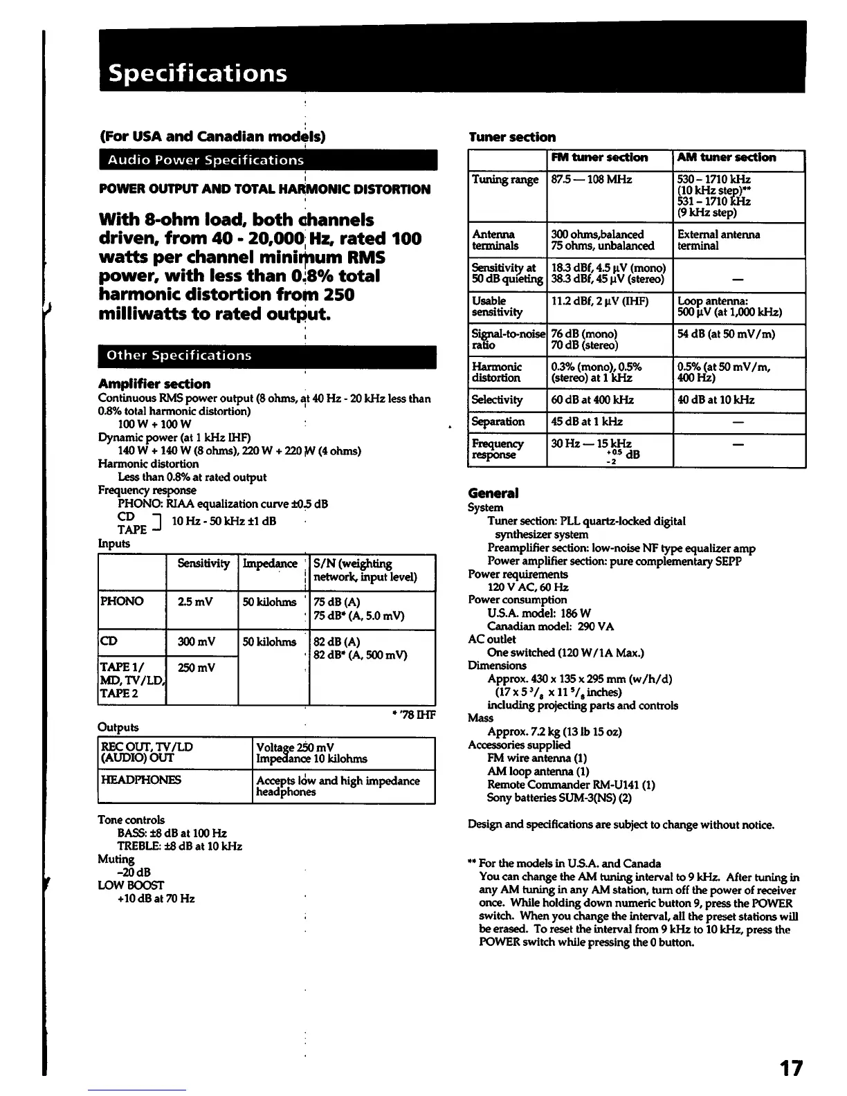 Sony STR-D315 - Specifications; Audio Power, Amplifier, and Tuner Specs
