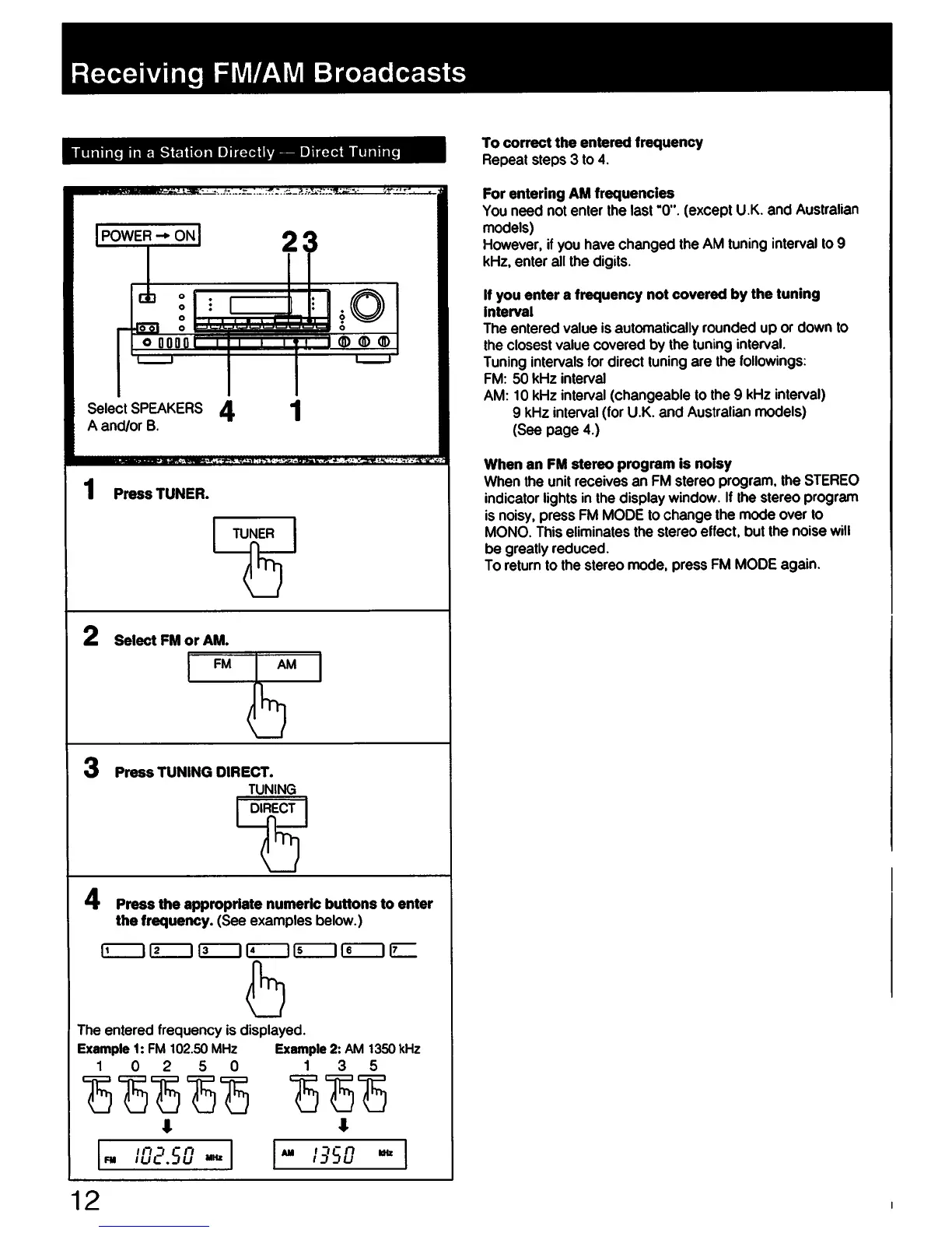 Sony STR-D511 - Receiving FM;AM Radio Broadcasts; Direct Station Tuning; Improving FM Stereo Reception