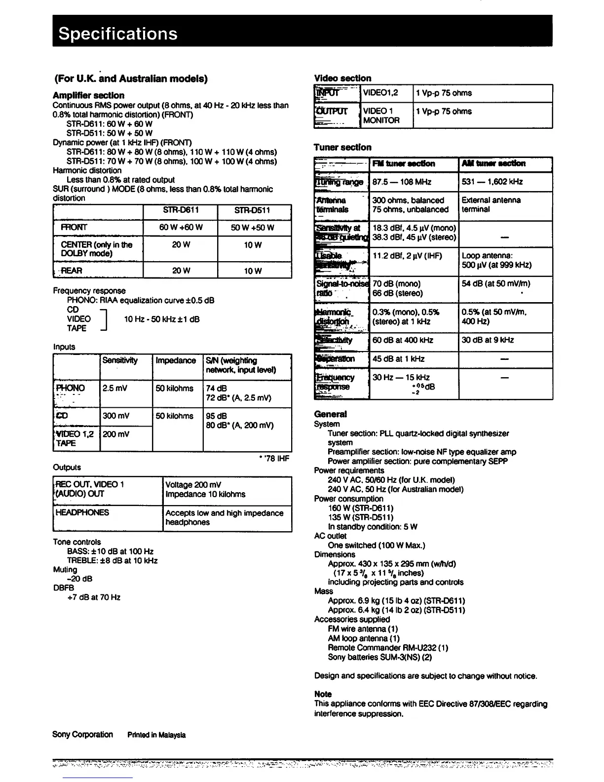 Sony STR-D511 - Technical Specifications; Model-Specific Specifications (UK;Australian); System, Power, Dimensions, and Mass; Included Accessories