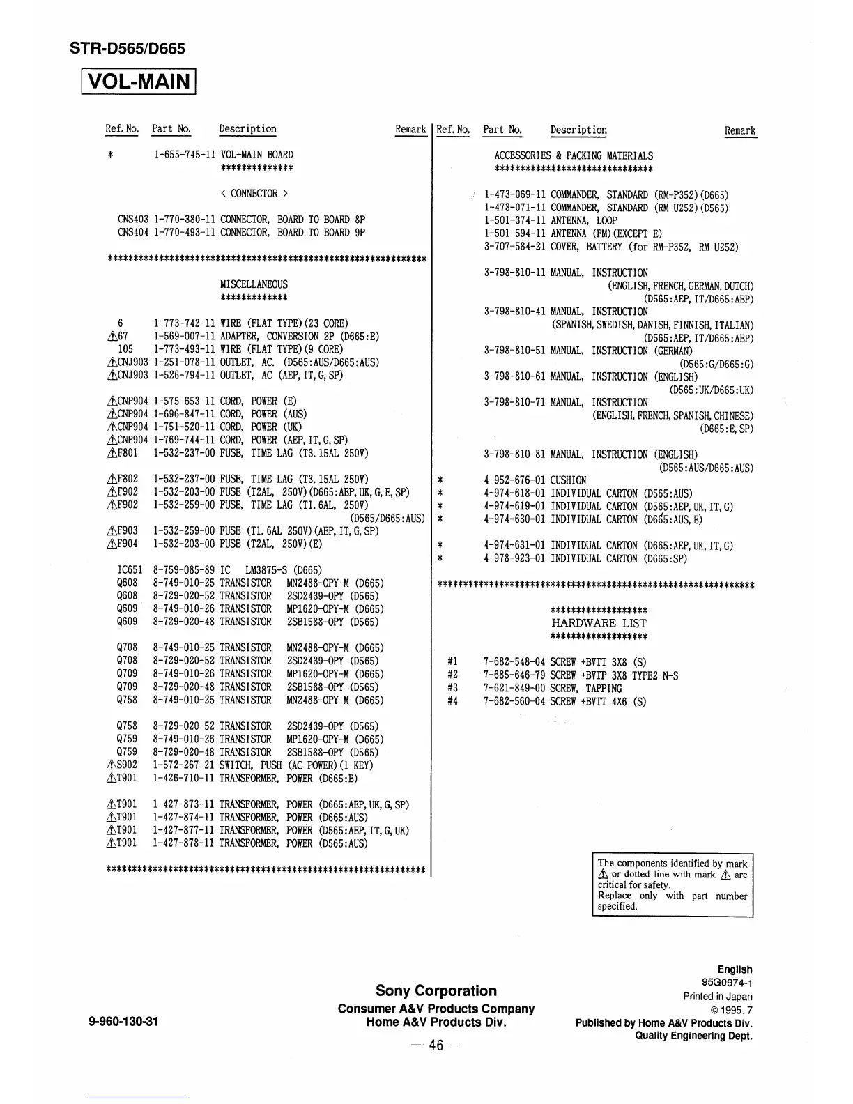 Sony STR-D565 - Vol-Main Board, Connectors, and Miscellaneous Parts