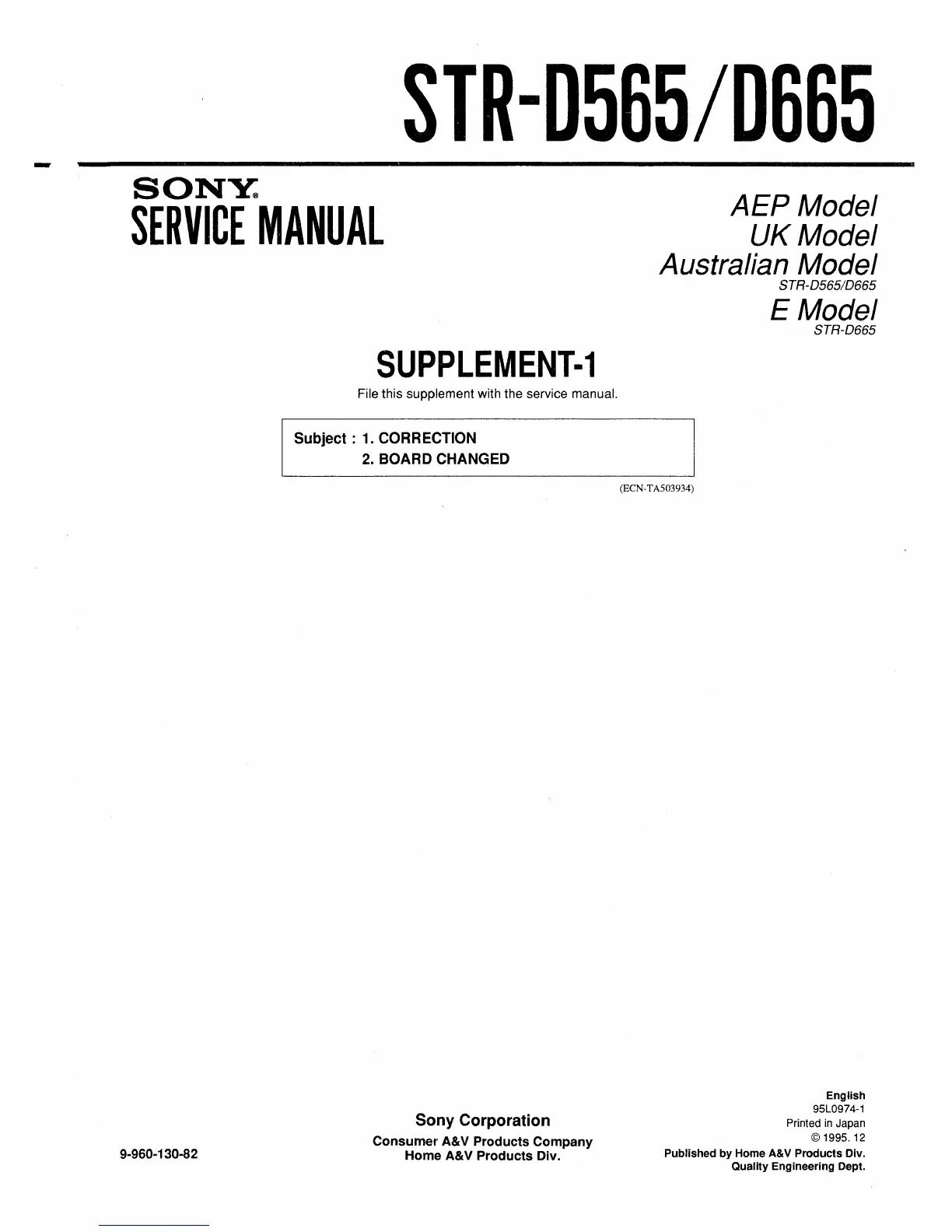 Sony STR-D565 - Supplement-1: Manual Corrections; Correction of Manual Errors; Board Changed Information