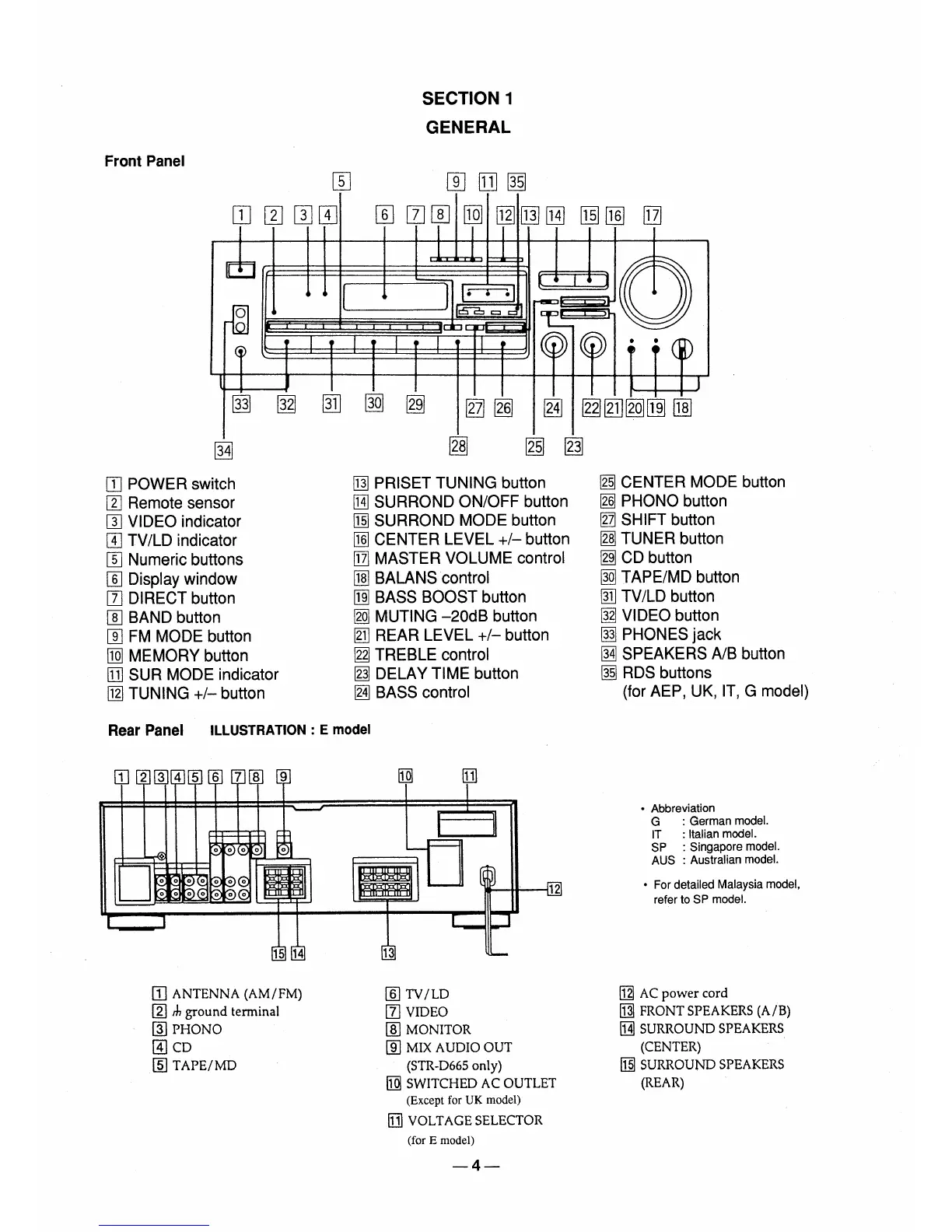 Sony STR-D565 - Section 1: General Information; Front Panel Controls and Indicators; Rear Panel Connections and Features