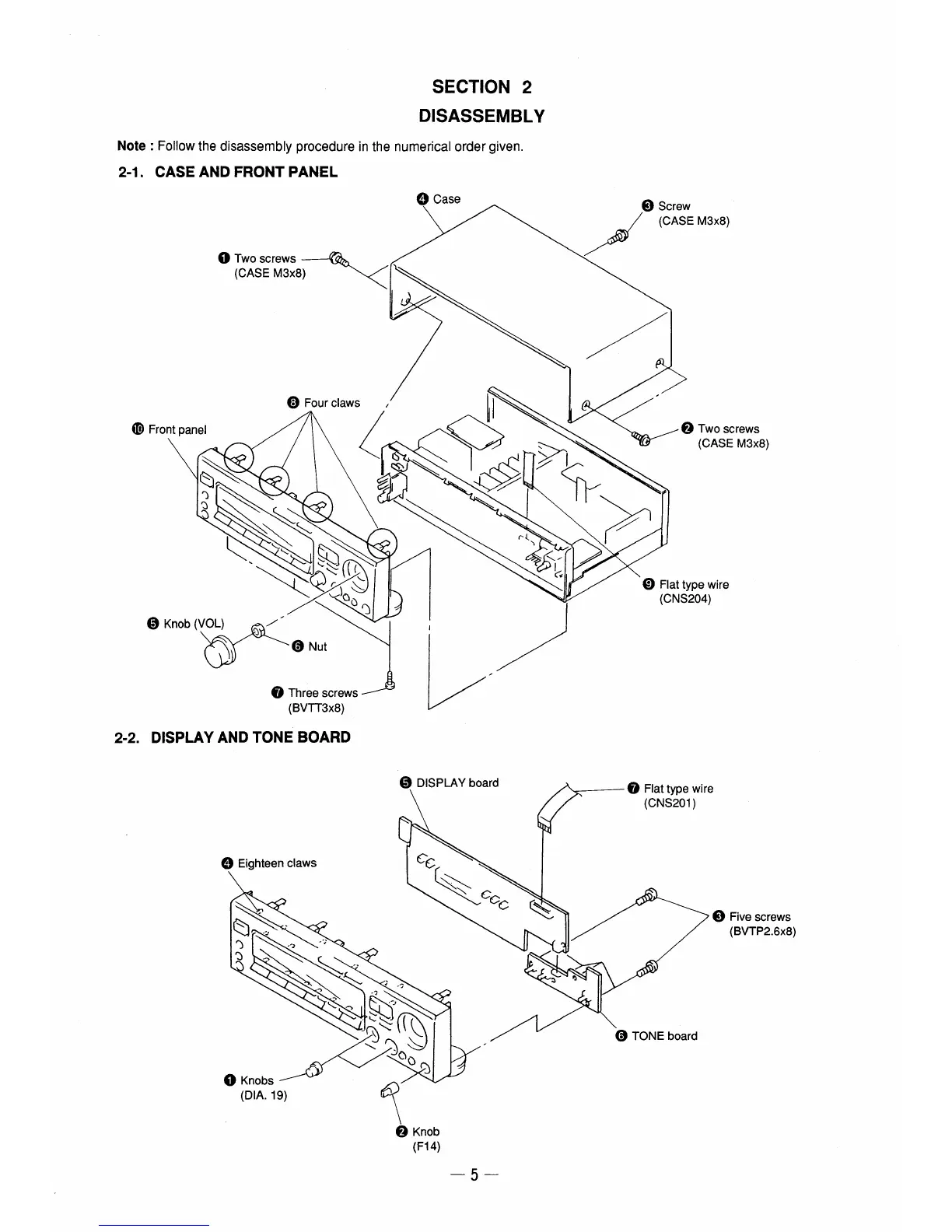 Sony STR-D565 - Section 2: Disassembly Procedures; Case and Front Panel Removal; Display and Tone Board Disassembly
