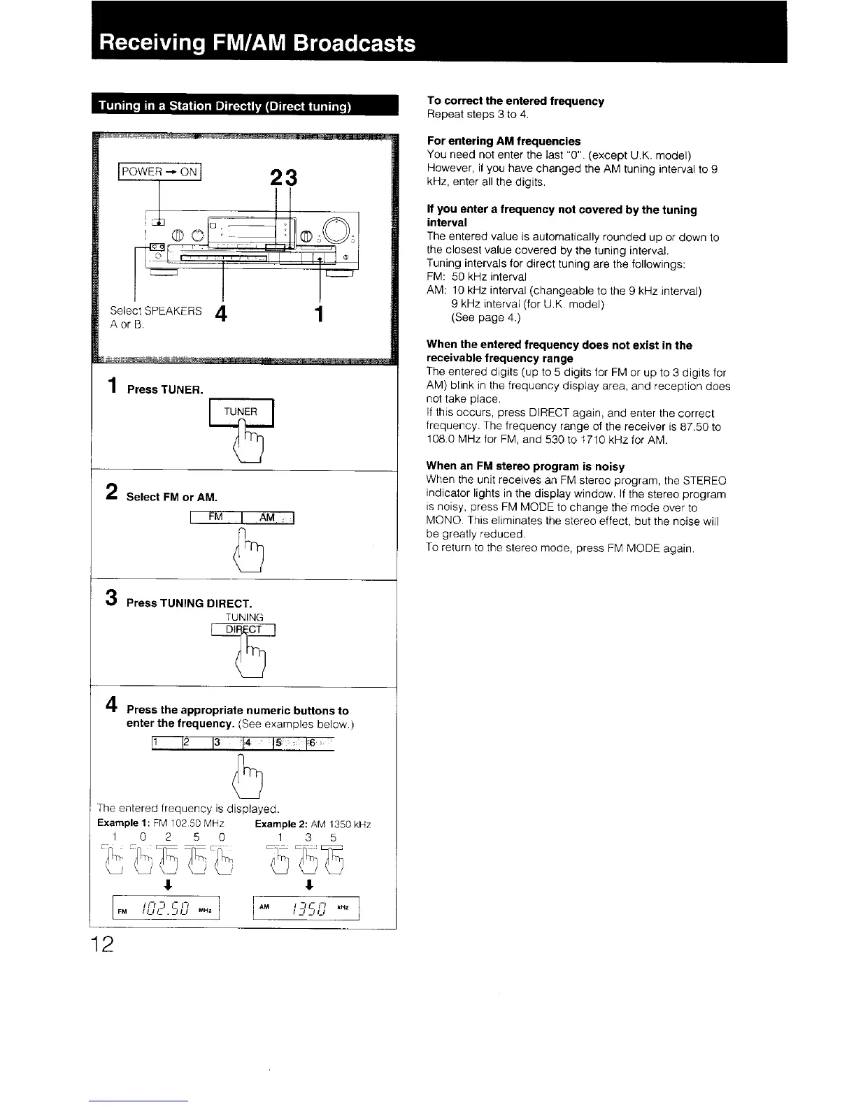 Sony STR-D590 - Receiving FM;AM Broadcasts; Direct Tuning of Stations; Handling FM Stereo Noise