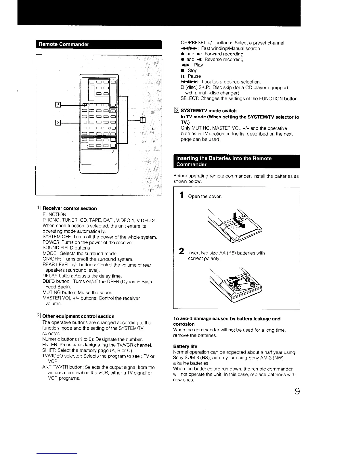 Sony STR-D590 - Remote Commander Operation; Receiver and Equipment Control Sections; System;TV Mode Switch; Inserting Remote Batteries