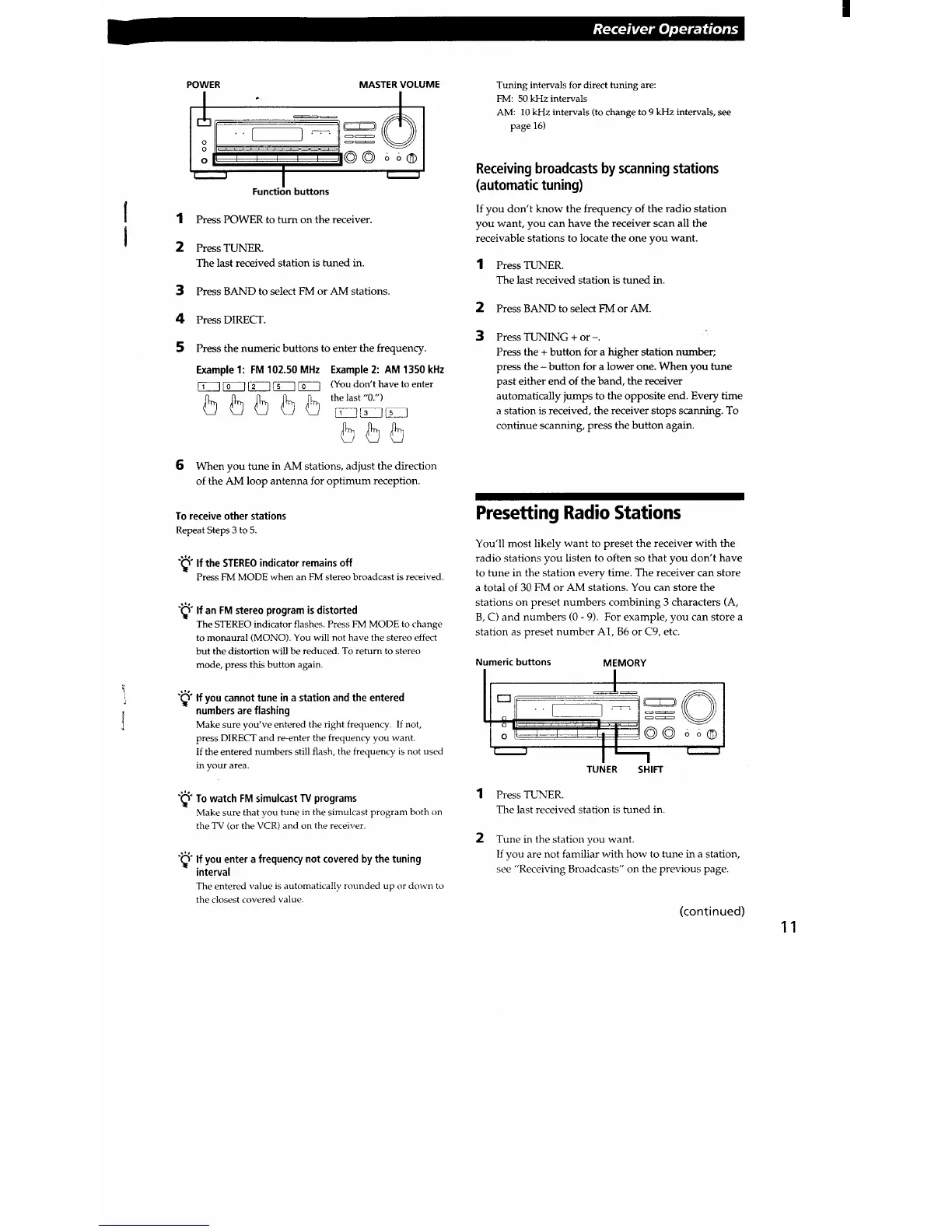 Sony STR-D665 - Radio Tuning and Presetting; Receiving Broadcasts: Direct and Automatic Tuning; Presetting and Tuning Radio Stations