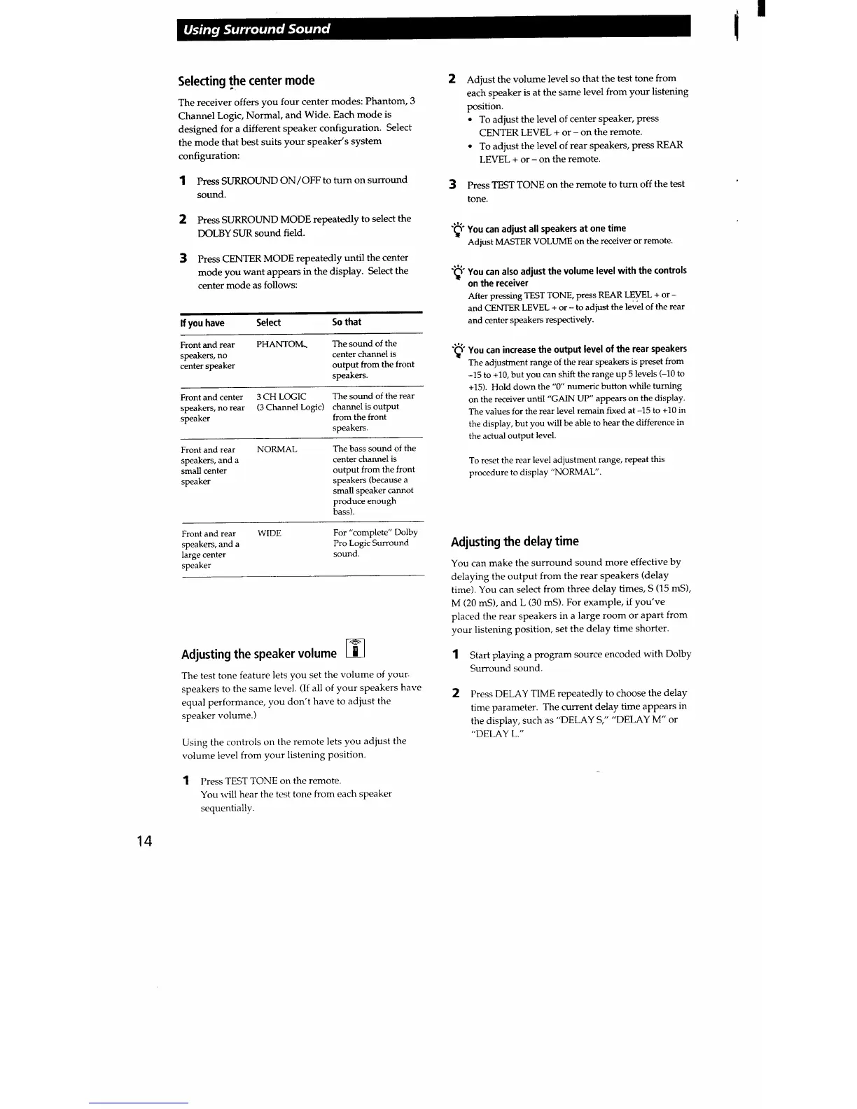 Sony STR-D665 - Surround Sound Adjustments; Selecting Center Modes and Adjusting Speaker Volume; Adjusting Surround Sound Delay Time