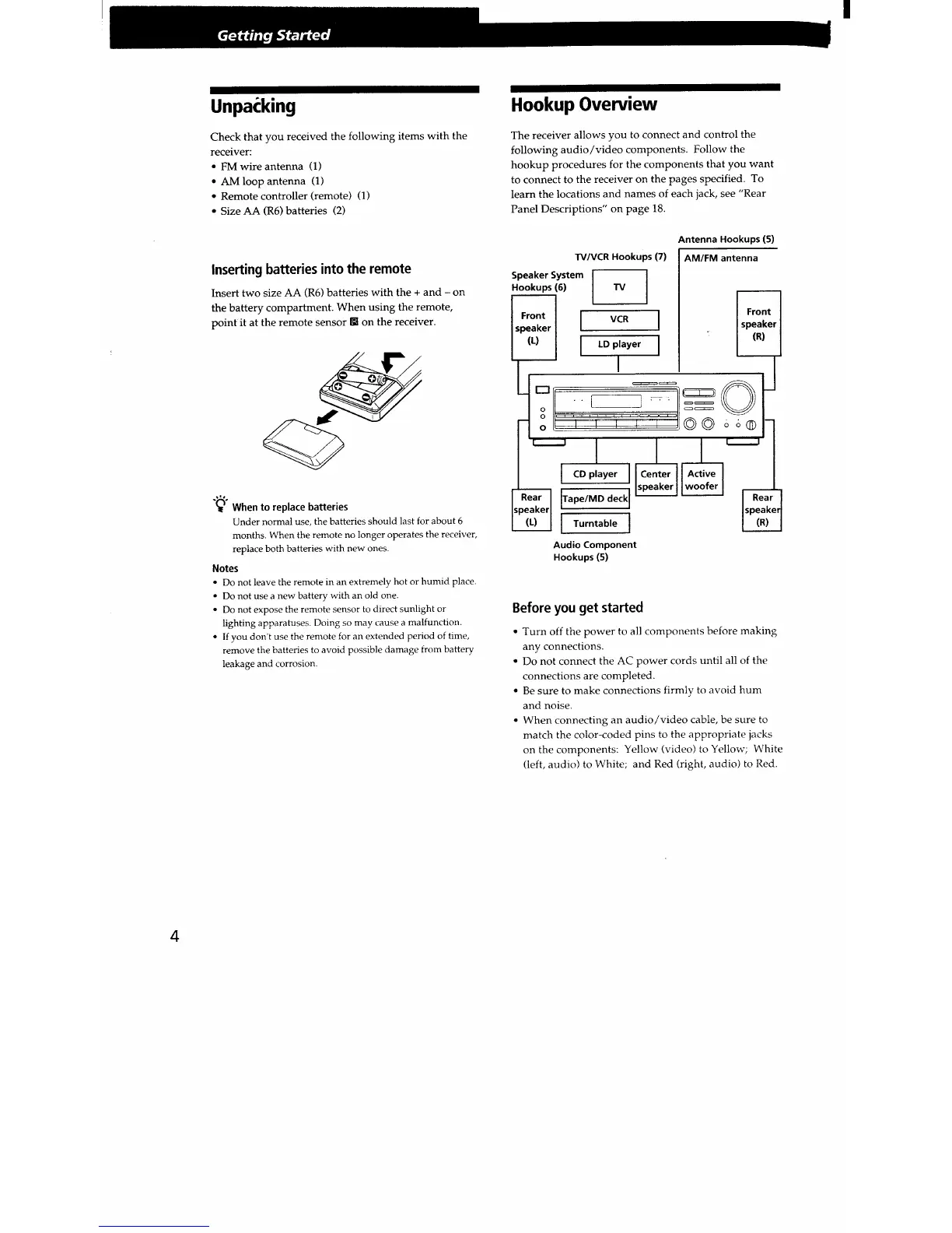 Sony STR-D665 - Getting Started: Initial Setup; Unpacking and Remote Setup; Hookup Overview and Preparation