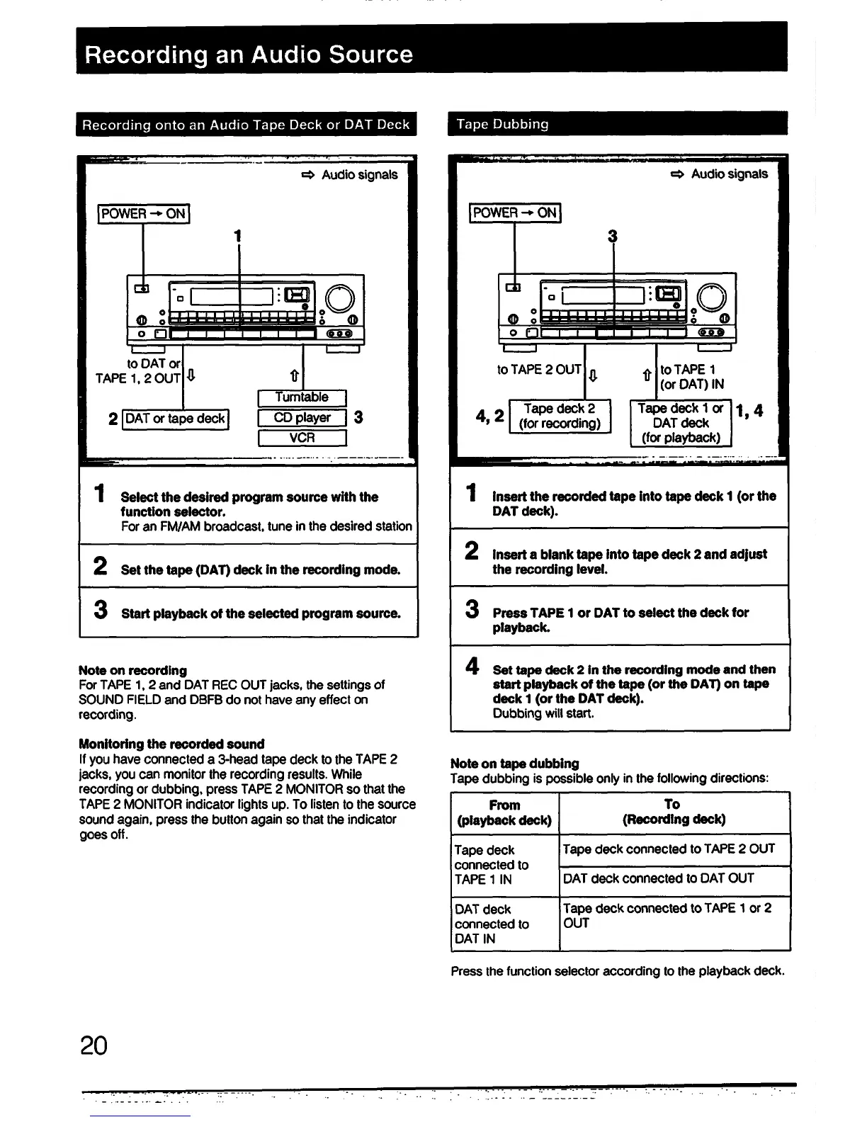 Sony STR-D711 - Recording an Audio Source; Recording onto an Audio Tape Deck or DAT Deck; Tape Dubbing