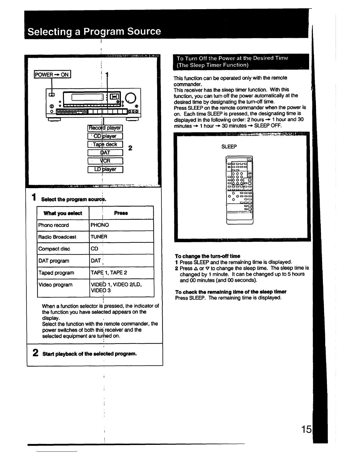 Sony STR-D790 - Source Selection and Sleep Timer; Selecting Program Sources