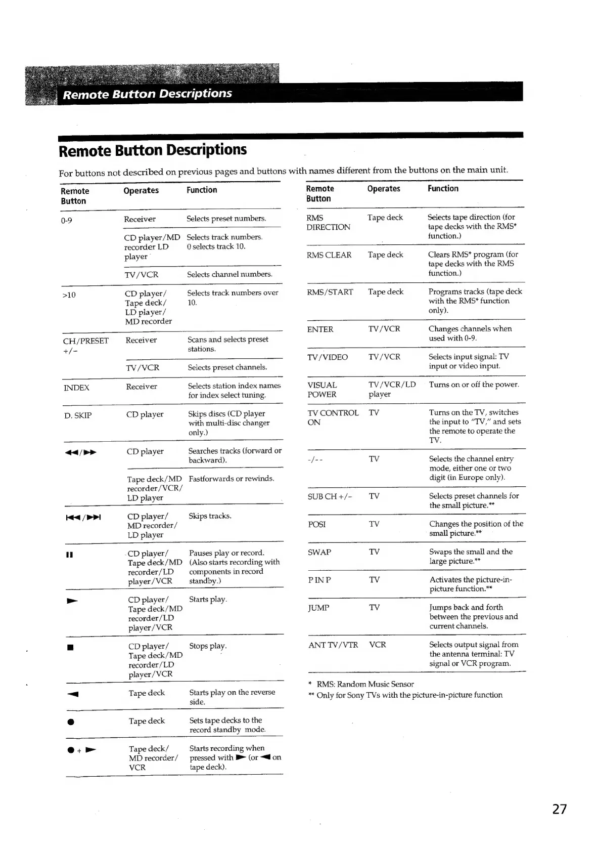 Sony STR-D865 - Remote Button Descriptions; Remote Button Functions
