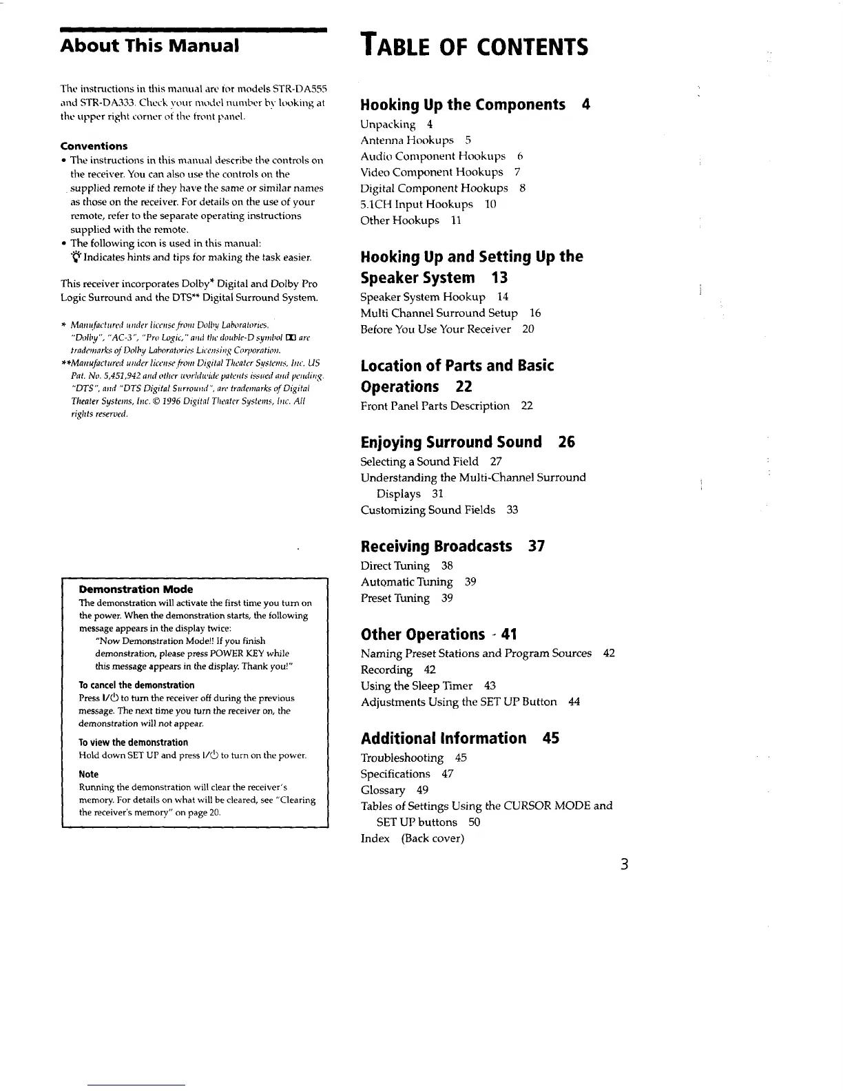 Sony STR-DA333ES Primary - Table of Contents; Demonstration Mode; To Cancel the Demonstration; To View the Demonstration